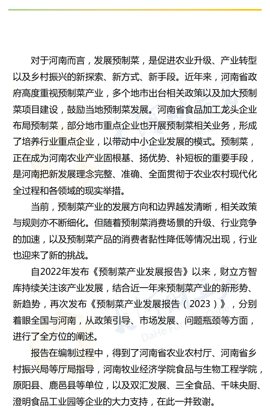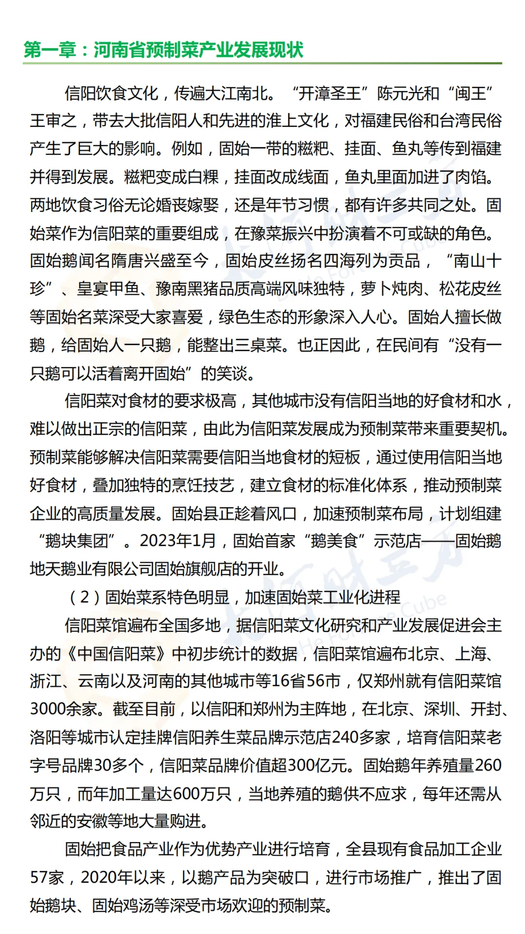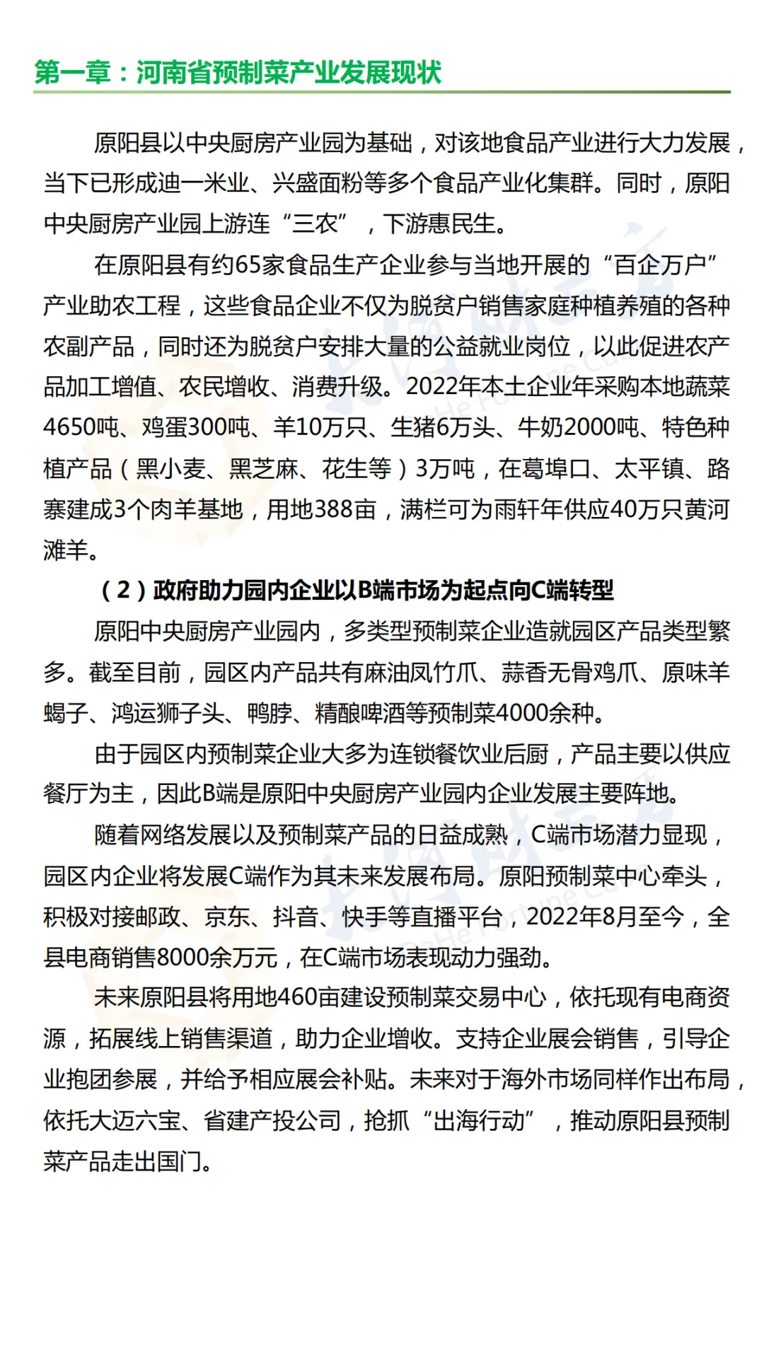 《河南预制菜产业发展报告(2023)》从全国与河南两大篇章入手,以探究全国和河南地区预制菜市场演变趋势。在全国篇,报告从预制菜产业的发展态势、市场需求变化、技术创新和竞争格局等方面梳理预制菜新发展特点,立体式呈现预制菜市场新风貌;在河南篇,报告立足河南省预制菜产业发展基础、预制菜企业发展现状、部分县市产业发展路径等,深入剖析河南省当前预制菜产业发展问题短板,找准河南预制菜产业发展道路。