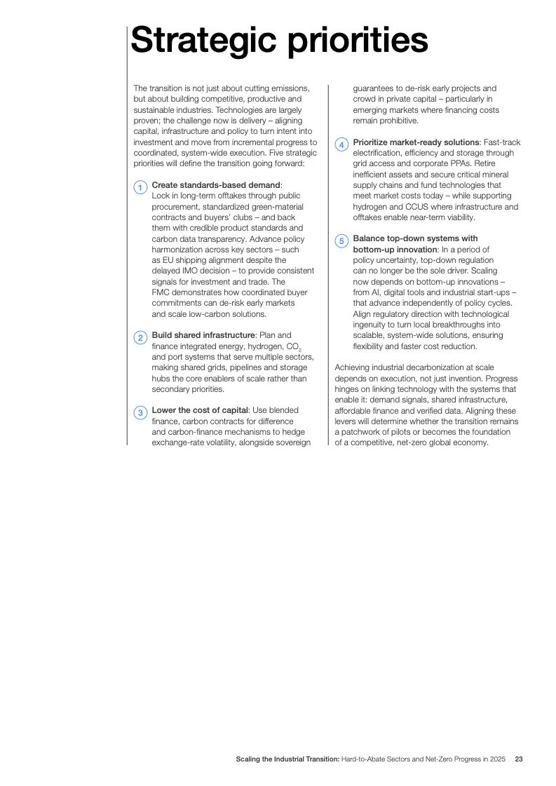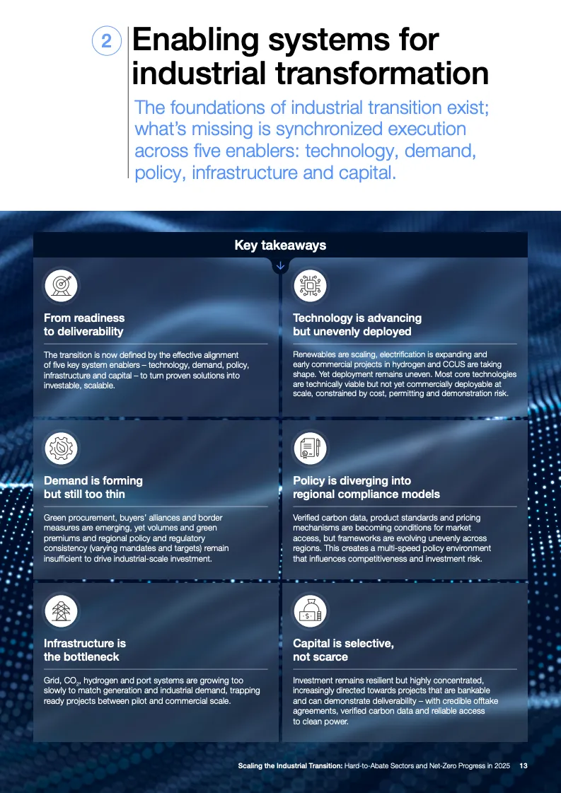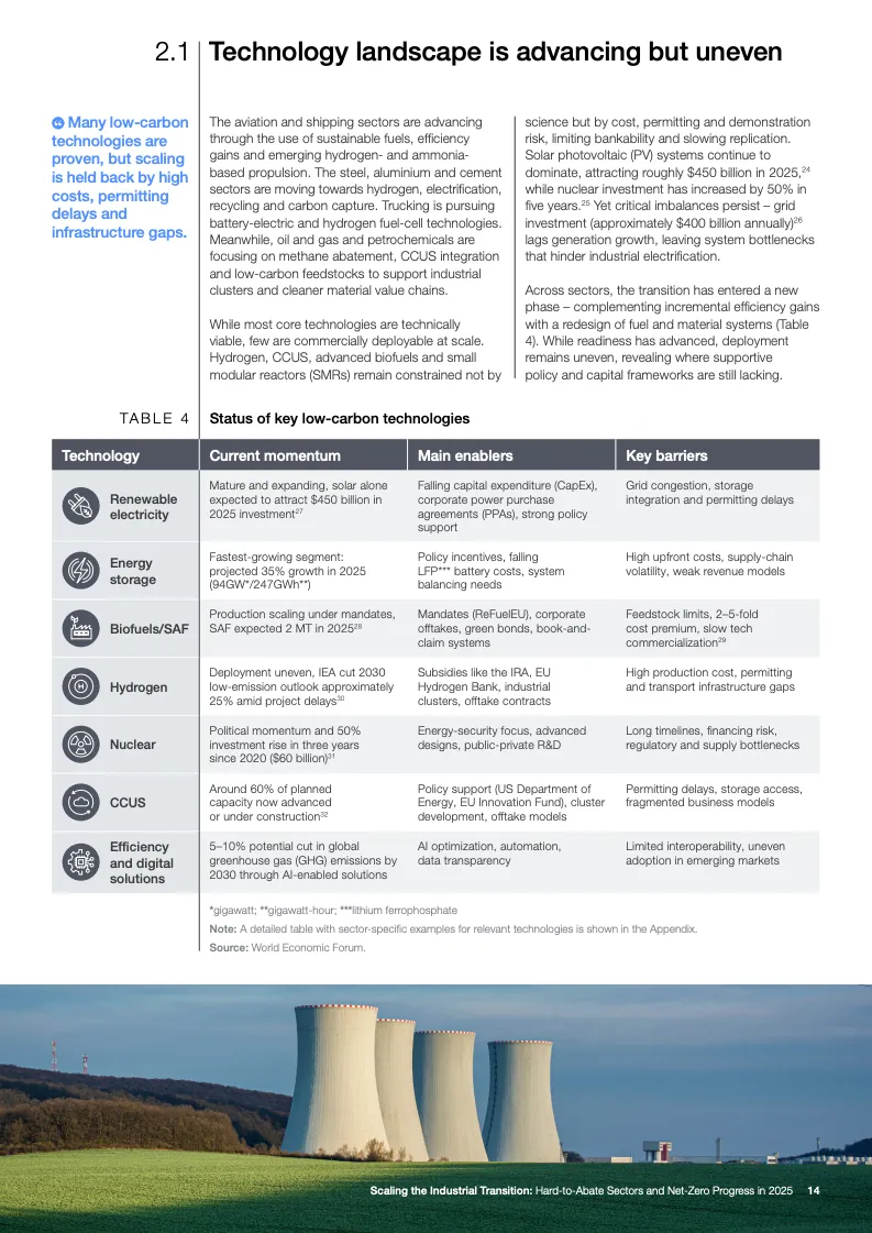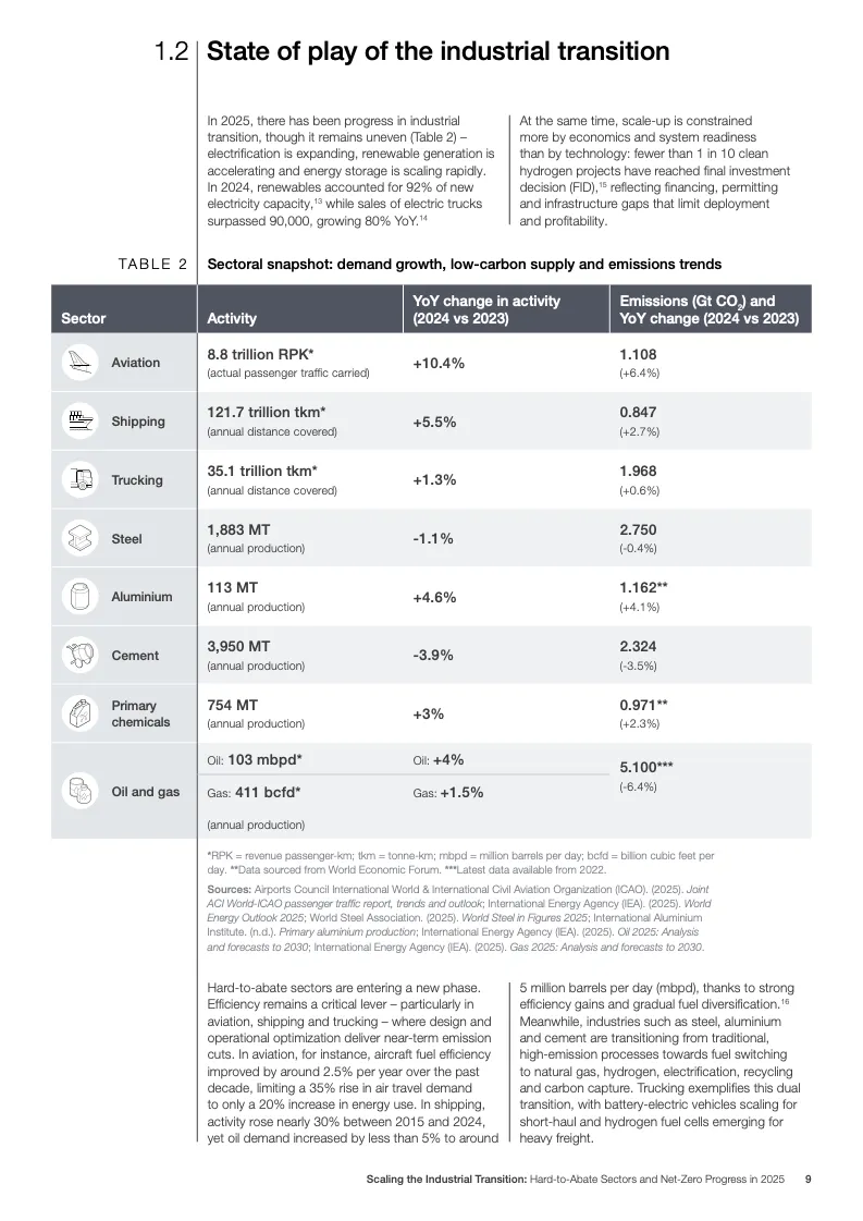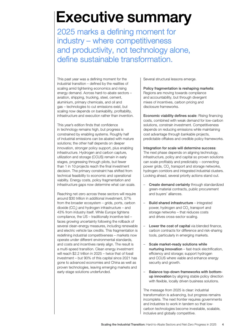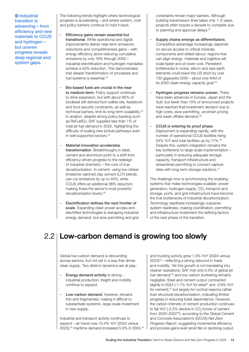 今年的报告发现,人们对技术的信心仍然很高,但进步受到系统支持的制约。成熟的解决方案可以减少大约一半的工业排放;另一半则取决于更深入的创新、更有力的政策支持,以及有利的基础设施。氢和碳捕集、利用和封存(CCUS)仍处于早期阶段,通过试点取得进展,但只有不到十分之一的项目达到了最终的投资决策。