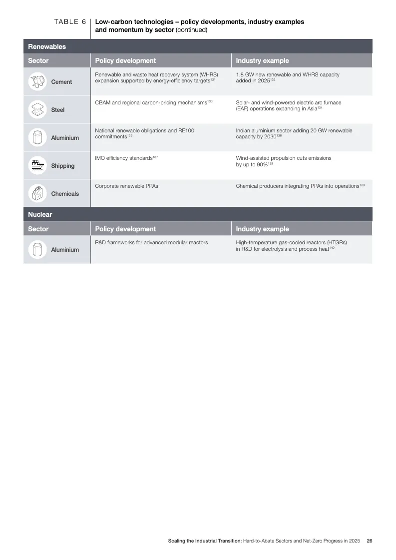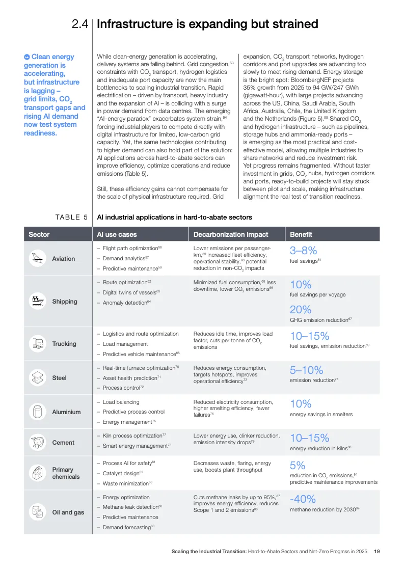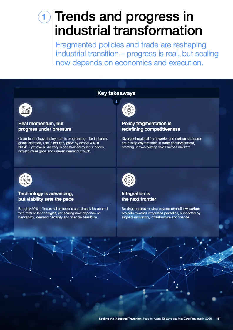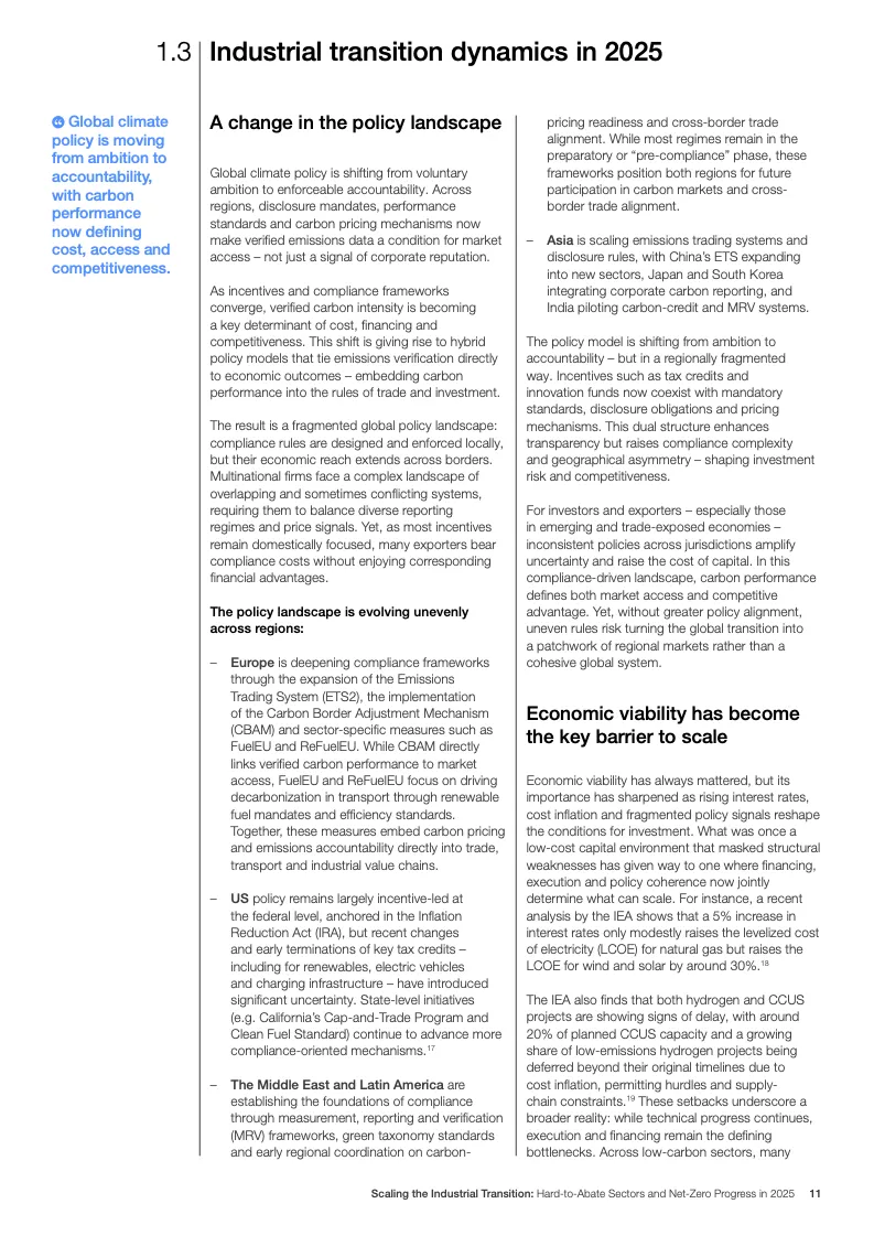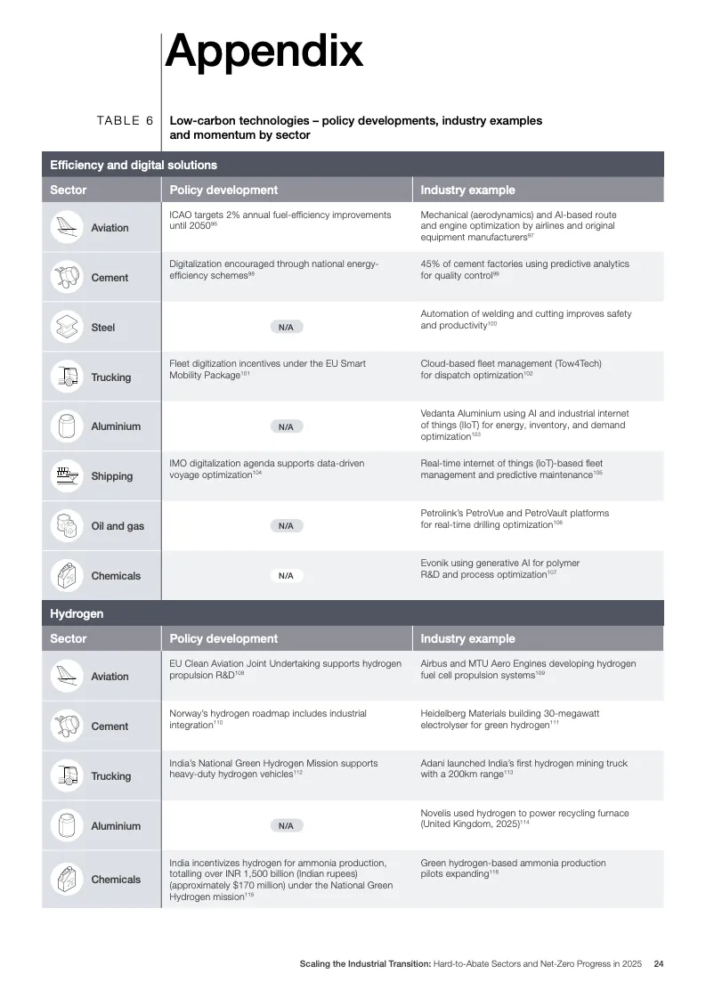 今年的报告发现,人们对技术的信心仍然很高,但进步受到系统支持的制约。成熟的解决方案可以减少大约一半的工业排放;另一半则取决于更深入的创新、更有力的政策支持,以及有利的基础设施。氢和碳捕集、利用和封存(CCUS)仍处于早期阶段,通过试点取得进展,但只有不到十分之一的项目达到了最终的投资决策。