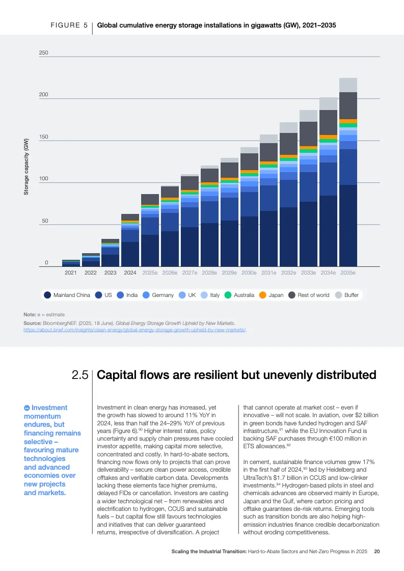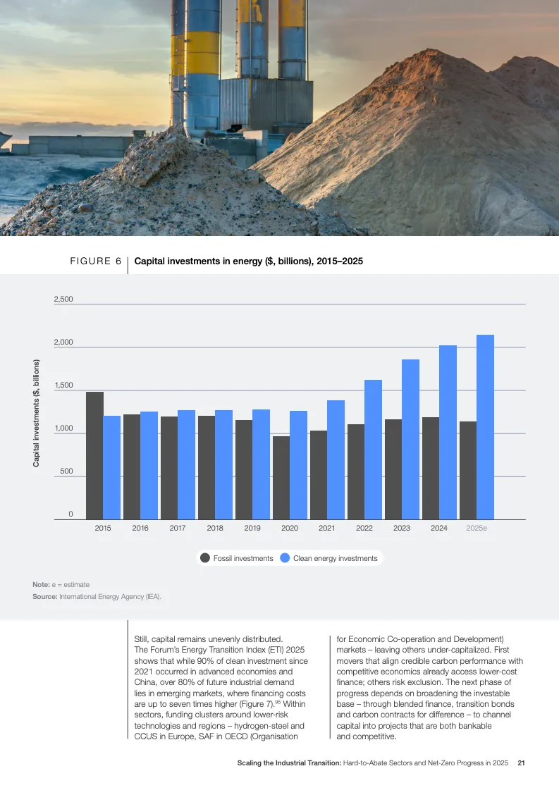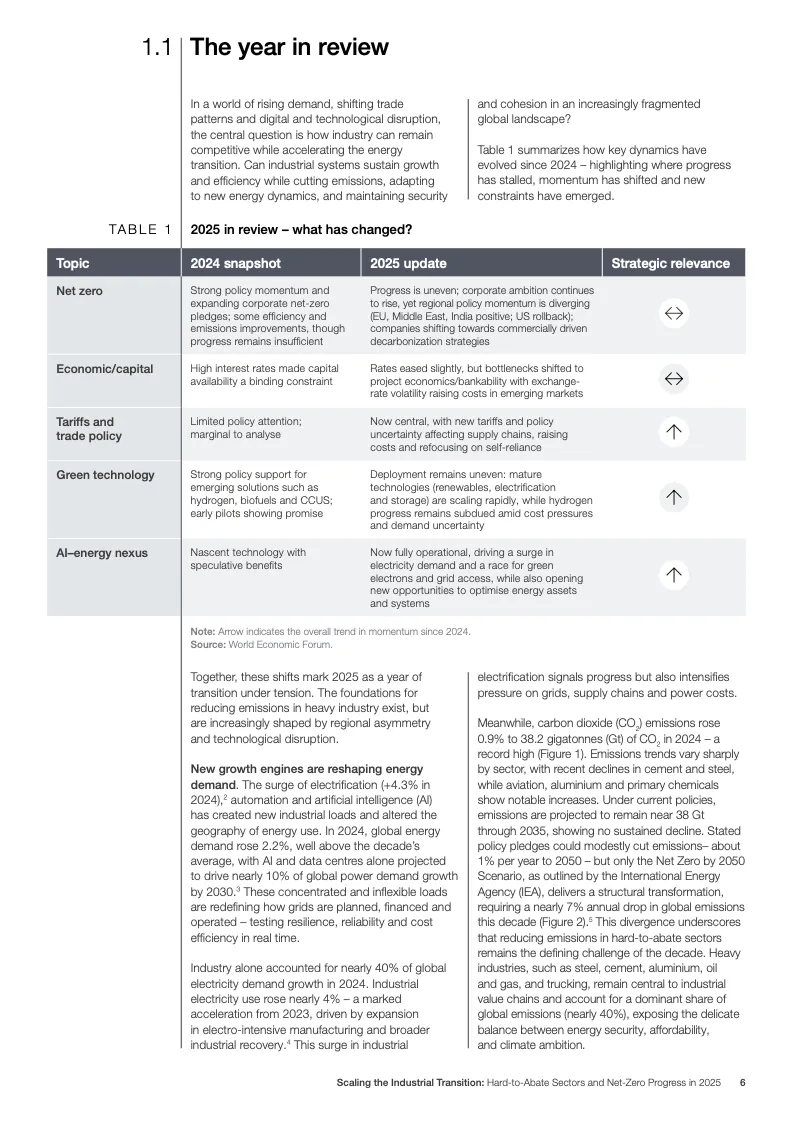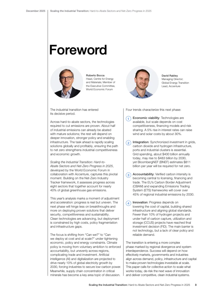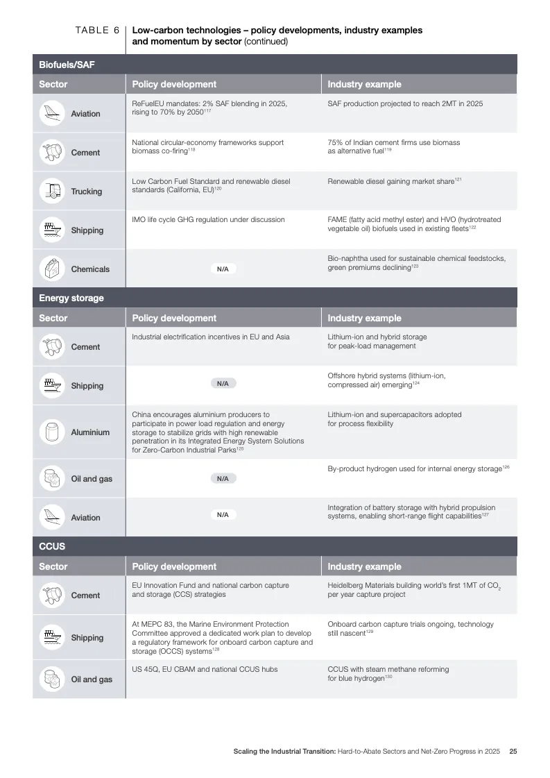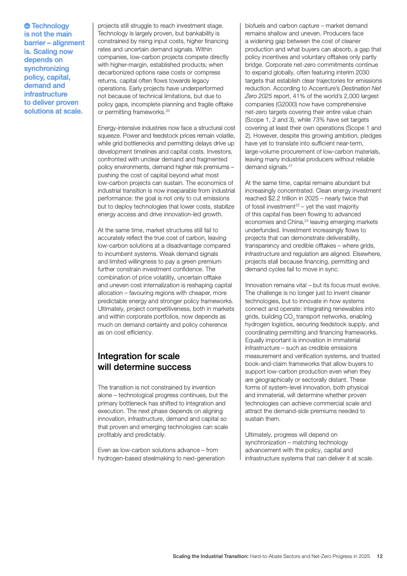 今年的报告发现,人们对技术的信心仍然很高,但进步受到系统支持的制约。成熟的解决方案可以减少大约一半的工业排放;另一半则取决于更深入的创新、更有力的政策支持,以及有利的基础设施。氢和碳捕集、利用和封存(CCUS)仍处于早期阶段,通过试点取得进展,但只有不到十分之一的项目达到了最终的投资决策。