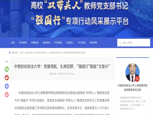 实现“双带头人”教师党支部书记全覆盖,高校思政网对旅游管理系党支部“强国行”专项行动成果予以报道,《中国教育报》报道《愿做深扎在高校沃土中的红色根系——高校“双带头人”教师党支部书记“强国行”专项行动一周年工作进展综述》。