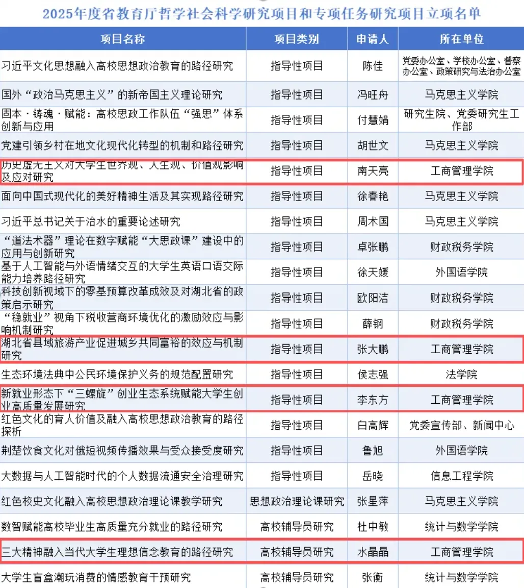 学院南天亮、张大鹏、李东方、水晶晶四位老师获批湖北省教育厅2025年度哲学社会科学研究项目和专项任务项目立项。