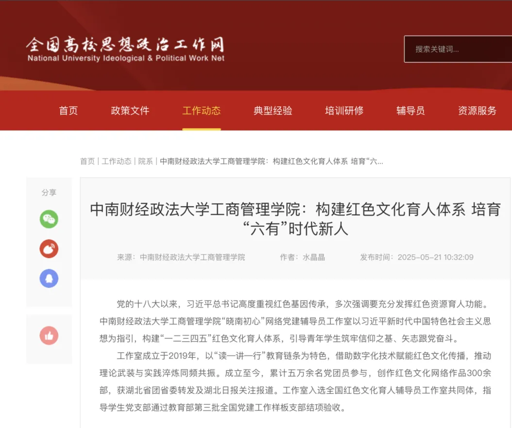 构建“理论研学共同体+实践赋能共同体+师生发展共同体”思想政治工作体系,高校思政网报道《工商管理学院:构建红色文化育人体系 培育“六有”时代新人》。