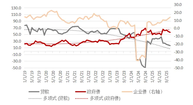 社融结构的变化进一步印证了这一判断。2025年新增社融中,银行信贷占比呈趋势性下滑,2025年二三季度甚至出现了近十几年来的首次负值。与此同时,政府债券发行在社融中的占比持续攀升,银行扩表越来越依赖政策性项目和政府融资链条,而非市场端的需求。