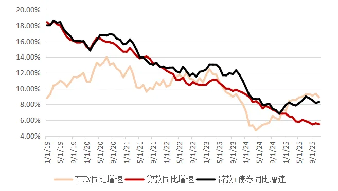 相比之下,中小银行呈现截然不同的局面:负债端不弱,资产端偏紧。区域性中小行深耕本地客户、黏性相对较强,存款同比增长8.9%,但贷款增长仅5.5%,贷款与债券合计增长8.3%。这一数据背后反映的是中小银行在资产端的“可选项”更少、获取优质资产难度更大的现实困境。在政府主导的融资格局中,中小银行受制于业务半径、风控能力、政策资源等限制,难以充分分享政府债券配置和政策性项目贷款的红利。