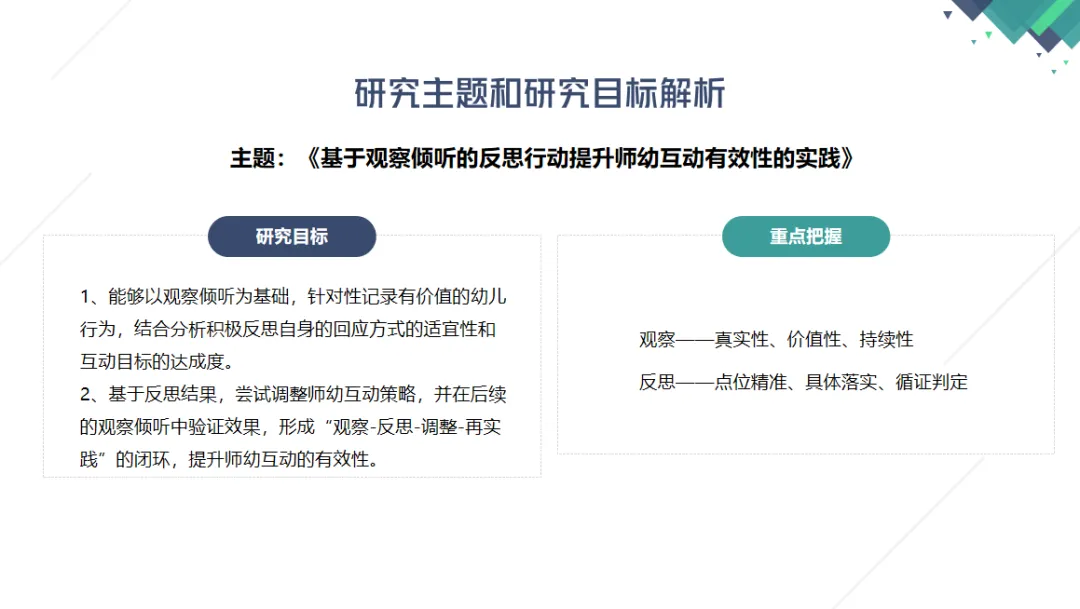 以《基于观察倾听的反思行动提升师幼互动有效性的实践》为主题,大教研按照“观察判断—分析反思—持续跟踪”的阶段性路径推进研究,为教师专业成长指明方向。