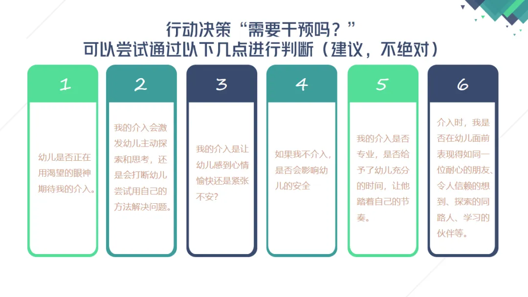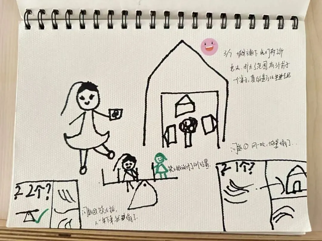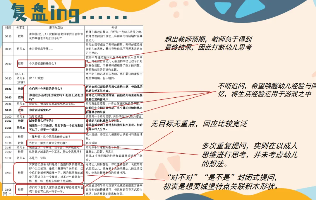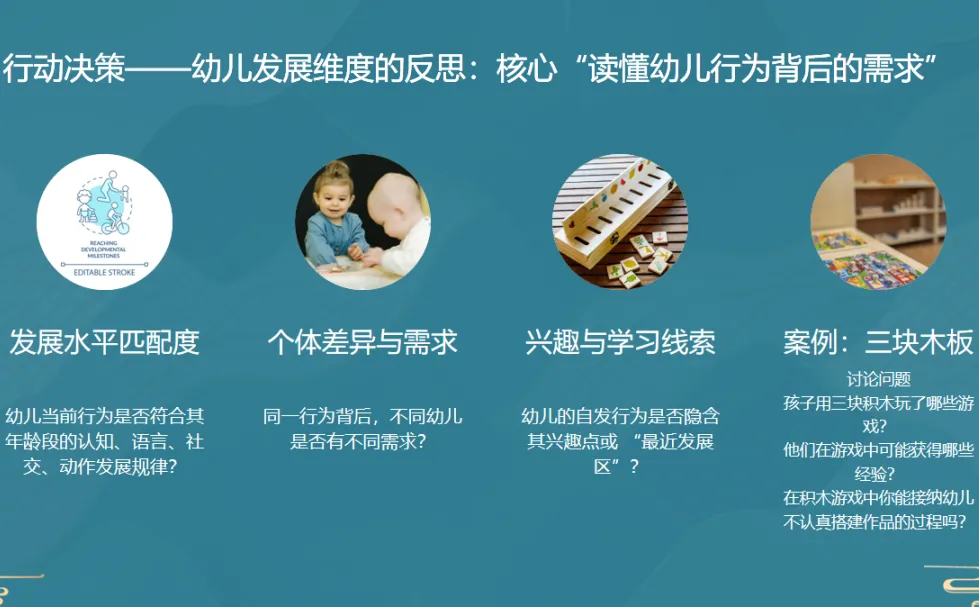 教研的第二阶段,结合“三块木板的游戏”和“跷跷板”的案例,与教师们探索了反思的闭环路径,从幼儿发展、教师行为、环境、互动四个维度,引导教师反思师幼互动的适宜性。研后,教师们纷纷尝试了“观察——反思——调整——再实践”的闭环实践。