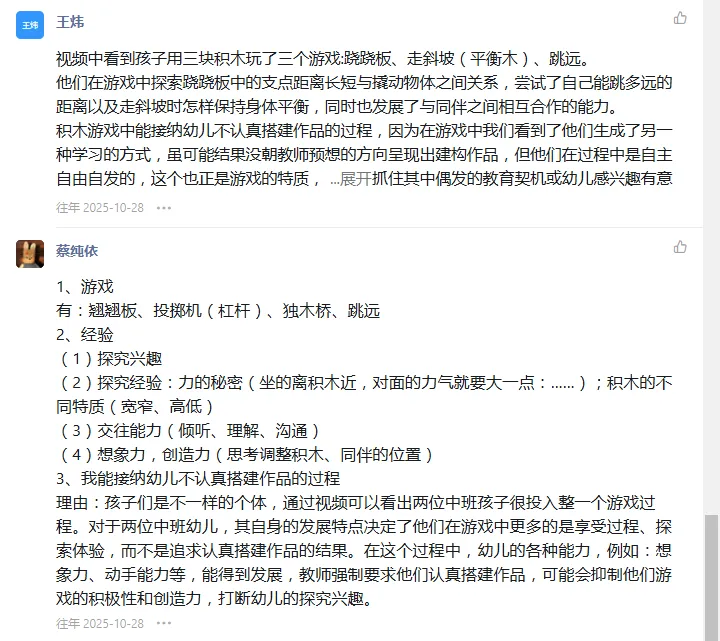 伴随着闭环实践的循环,教师们纷纷在Ucare平台上分享了各自的跟踪性性观察案例。通过同伴互阅点评和“小球滑轨”课程故事的分享学习,教师们清晰了需要追踪幼儿游戏行为、社交互动、能力发展等 5 个核心要点的动态变化,梳理跟踪性观察的脉络轨迹,寻找幼儿行为和教师回应支持之间的关联。也体会到了多维证据列举在跟踪性观察中运用的实际作用和价值。