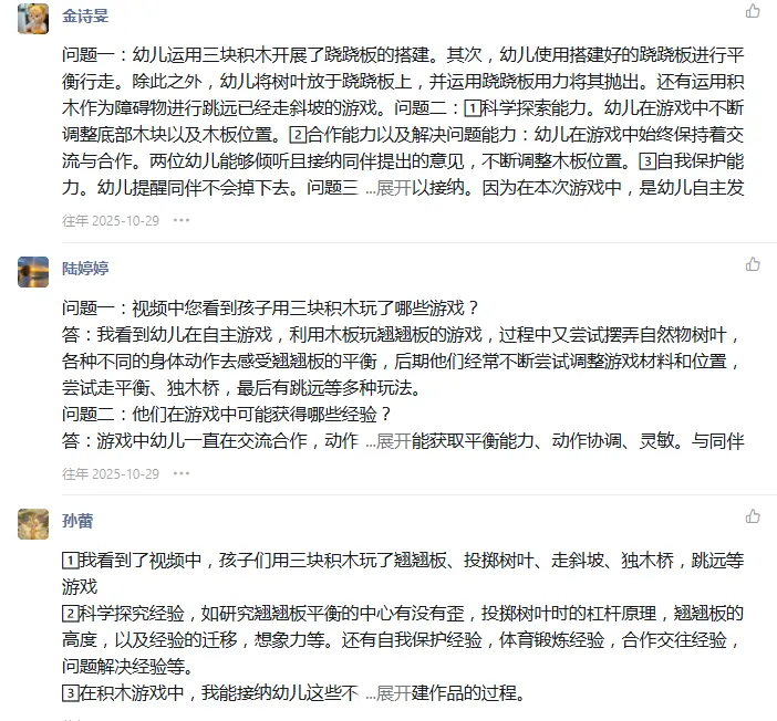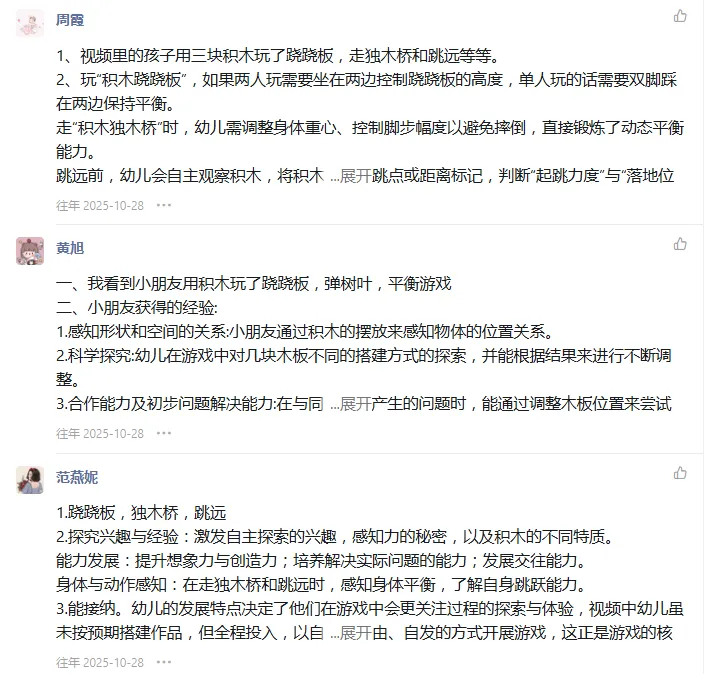 同时,游戏工作坊的园本培训以《评估指南》中师幼互动要求为核心依据,结合专家观点,引导教师跳出“策略技巧”局限,掌握提升互动质量核心逻辑,即少介入、多等待,少“我以为”、多循证,少结果评讲、多过程解读。从思想根源为教师赋能,实现“实操提升”与“理念革新”同频共振。