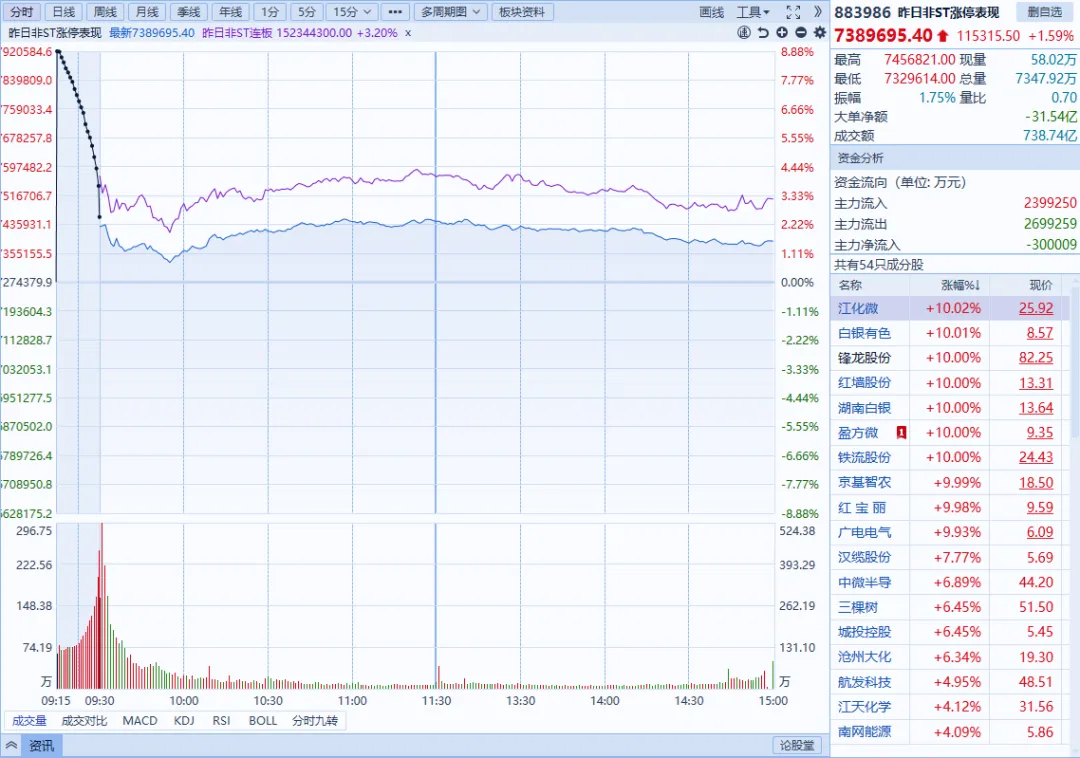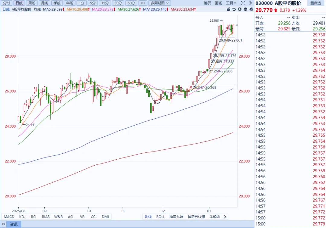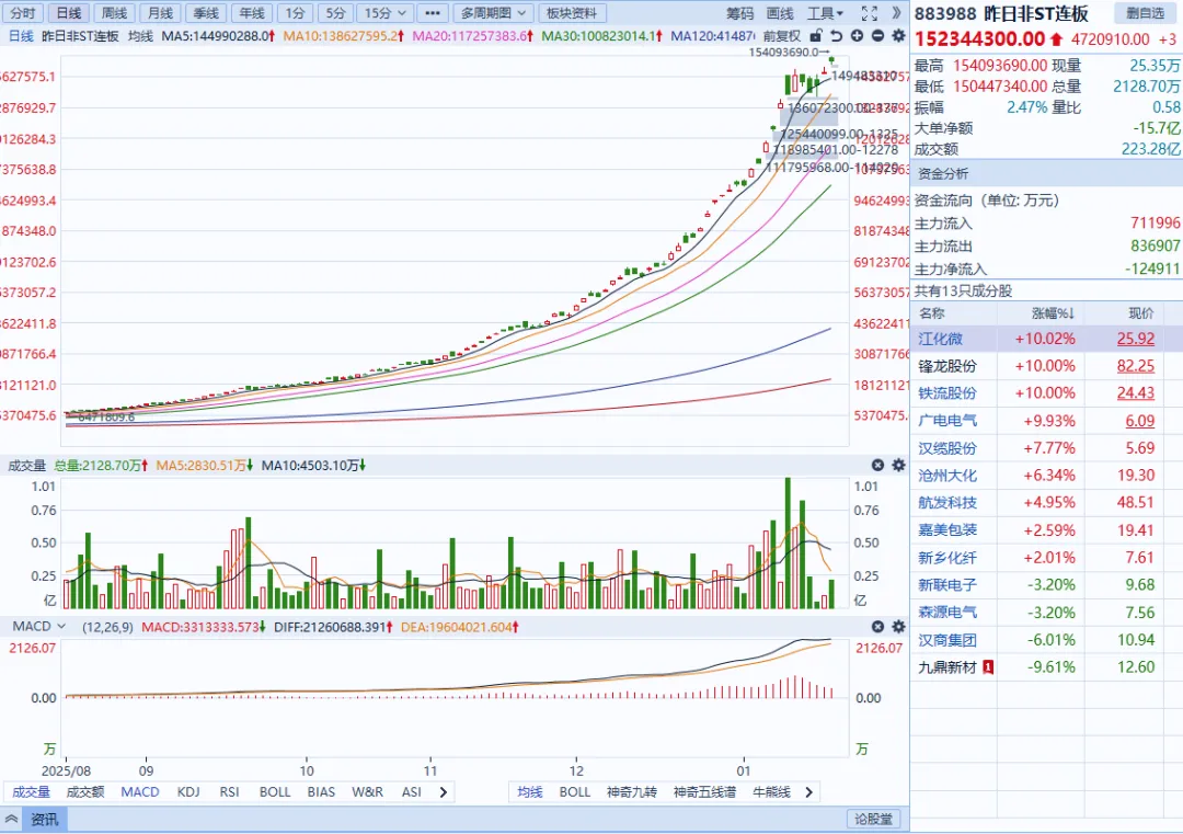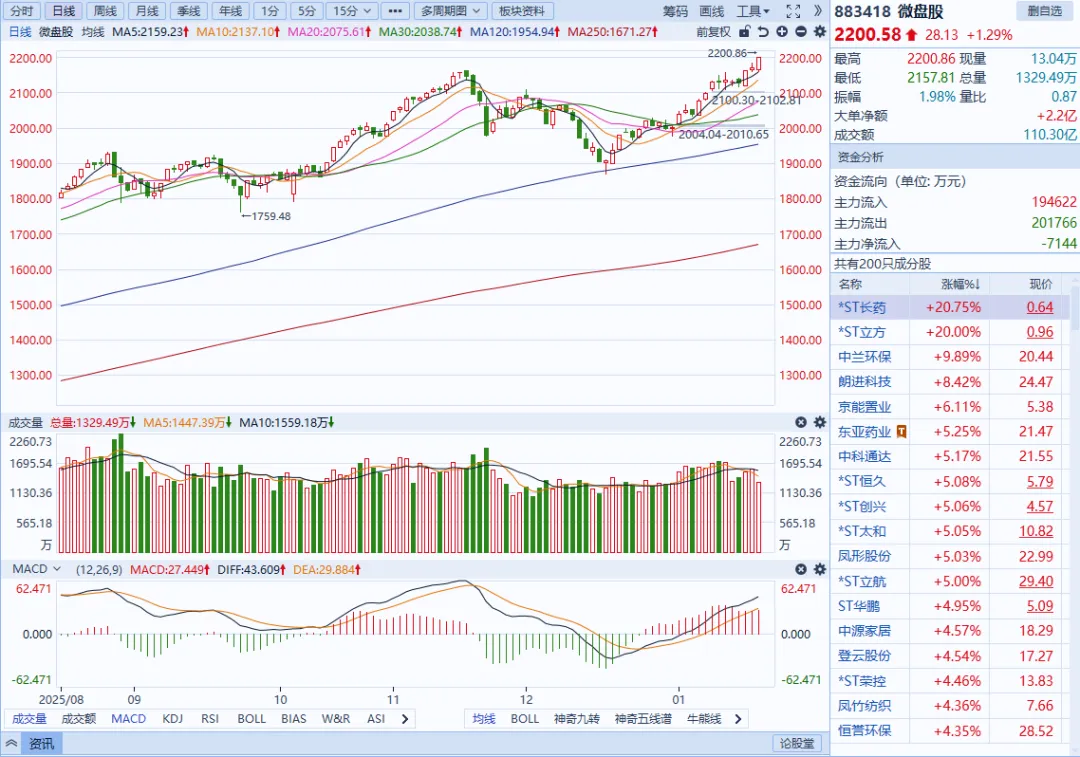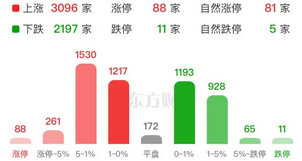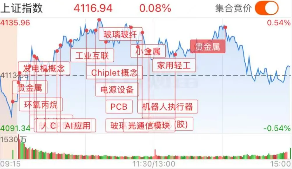 个股方面:涨多跌少,3096只个股上涨,2197只个股下跌。盘面上,市场热点快速轮动,全市场超3000只个股上涨。从板块来看,贵金属概念全天领涨,四川黄金、招金黄金涨停。芯片产业链爆发,华天科技、龙芯中科、至正股份等十余股涨停。锂矿概念震荡反弹,盛新锂能、大中矿业、国城矿业涨停。油气概念表现活跃,惠博普、洲际油气涨停。下跌方面,大消费板块集体走弱,白酒方向领跌。银行板块震荡下跌,农业银行跌近3%。