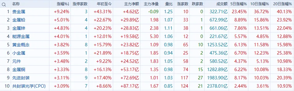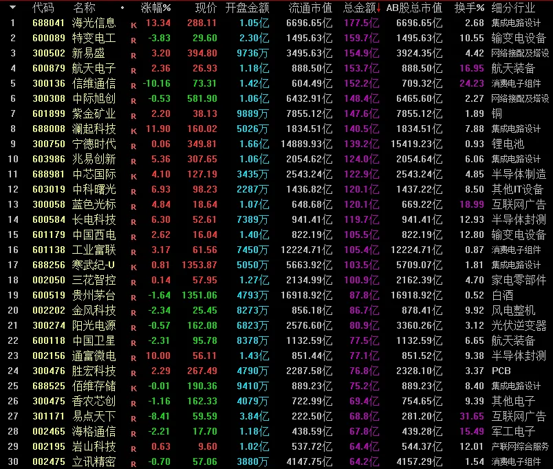 资金净流入前列:半导体、计算机设备、有色金属等净流入排名靠前,其中半导体净流入120.70亿元。