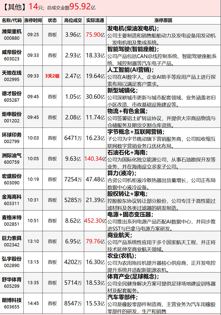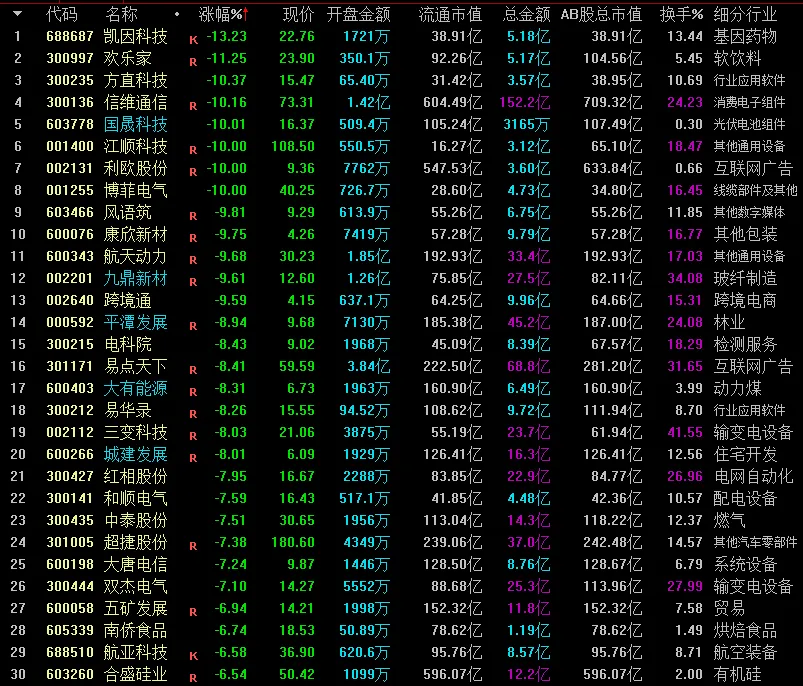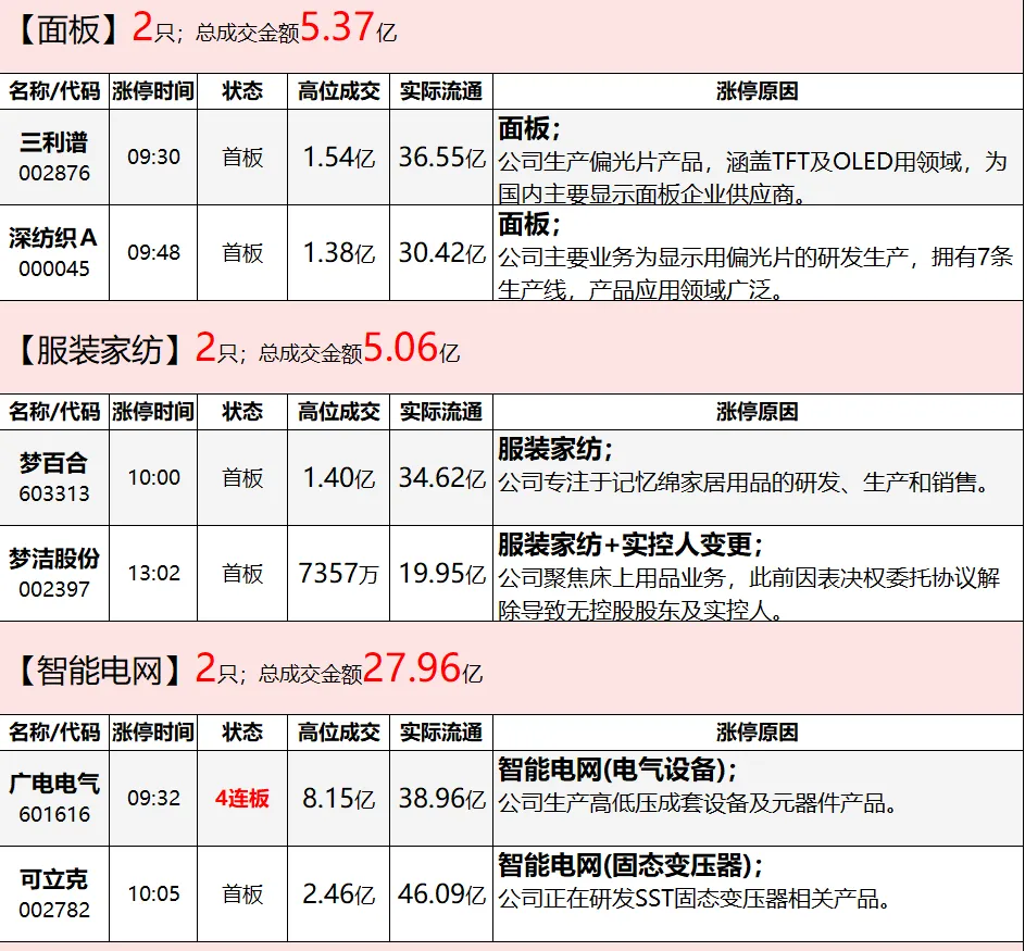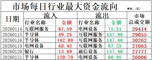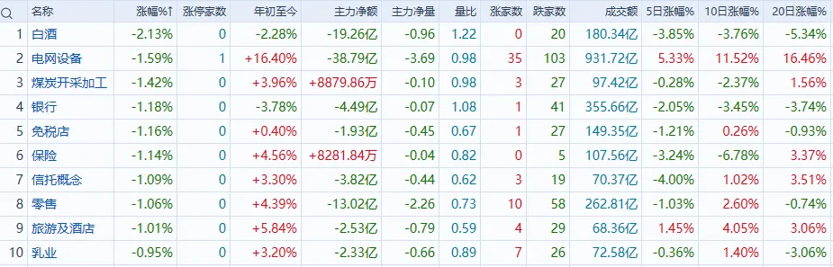 资金净流出前列:电网设备、酿酒行业、光伏设备等净流出排名靠前,其中电网设备净流出60.95亿元。