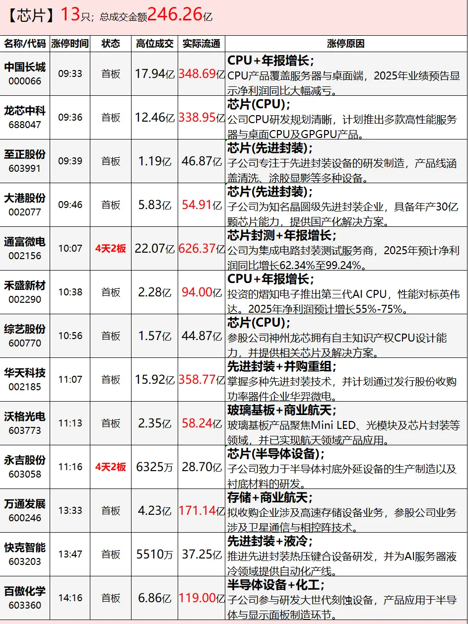 半导体/AI算力:存储芯片、先进封装方向领涨,通富微电、长电科技等多股涨停,板块受AI需求爆发及国产替代加速催化。