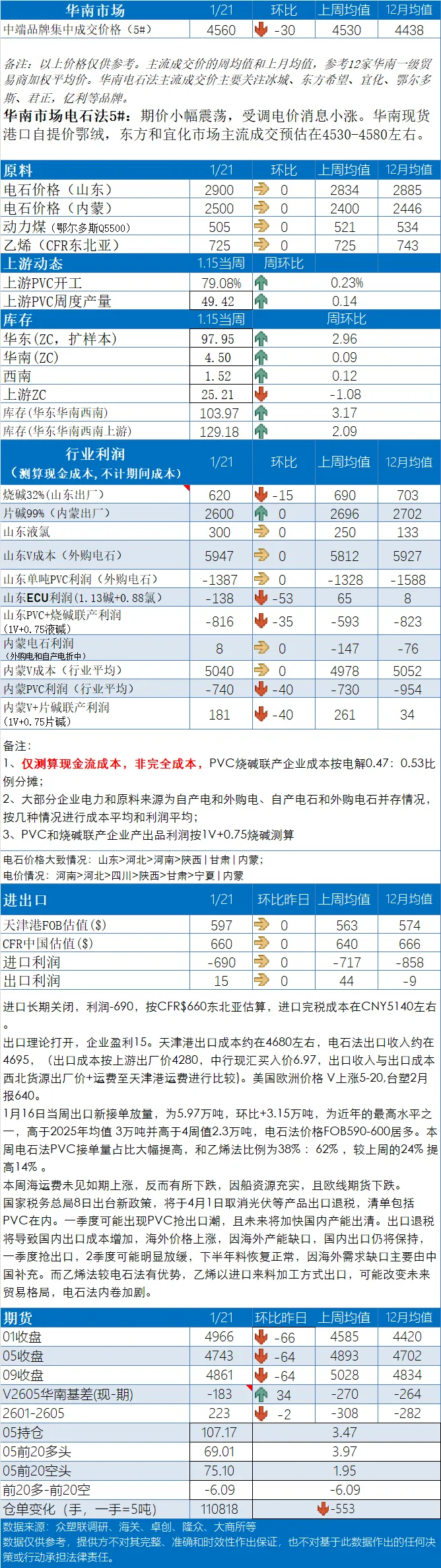 •期货市场:截至 1 月 21 日,PVC 期货 V2605 合约下午收盘价4743 元 / 吨,涨跌幅 -1.33%,结算价4744 元 / 吨 ,持仓量107.2 万手,较上一交易日增加 34620 手,成交量132.4 万手。
