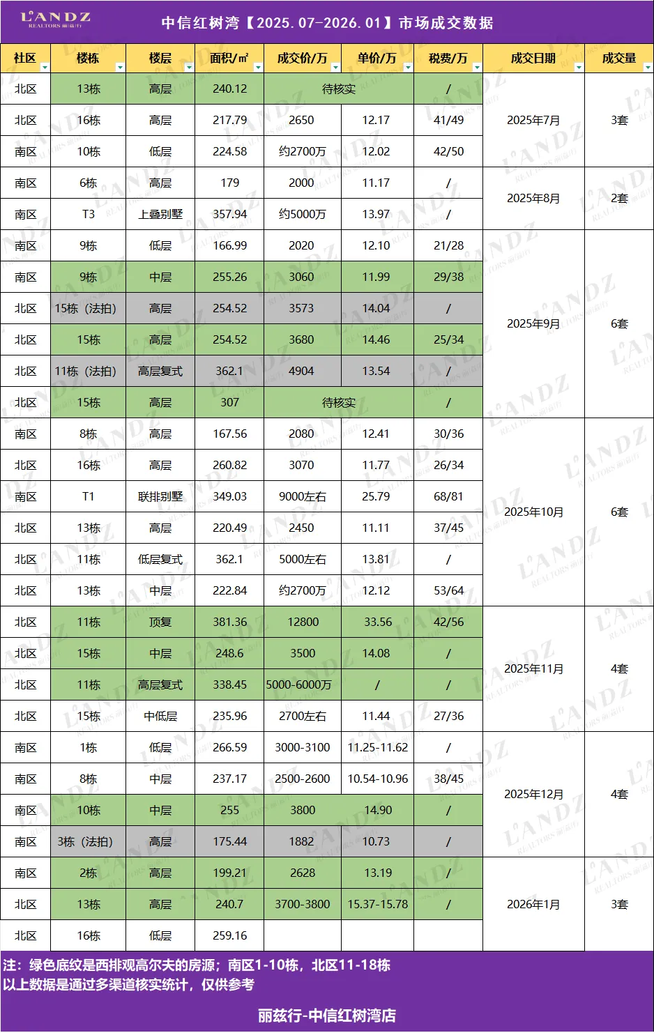 中信红树湾1月累计成交3套大户型平层。其中高层一线高尔夫景观成交单价13-15万,还是比较不错的价格。