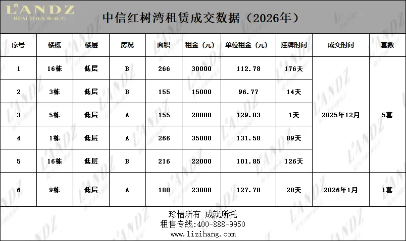 本月中信红树湾大户型租赁成交1套。春节前后租房客户量减少,房屋保养较好或价格更低的房源可以更快成交。