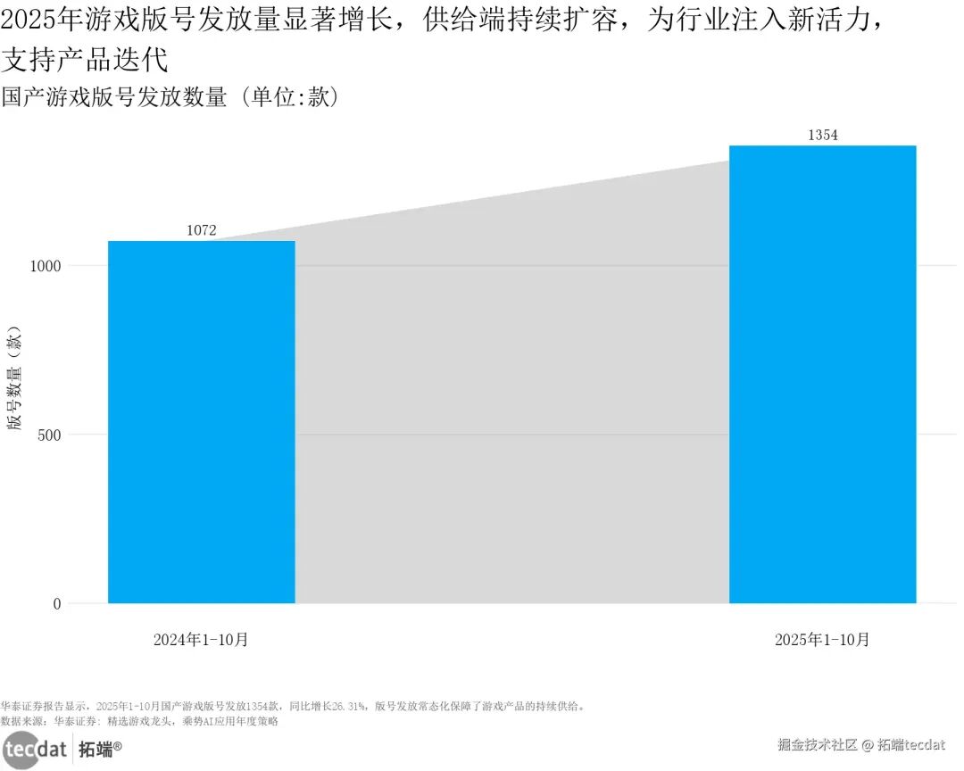 3秒解读:增长动能集中于上半年窗口期,新品表现与节日运营是核心拉动力。行动建议:开发者可聚焦Q1、Q2新品上线节点,借势节日流量红利;投资者重点关注手握Q1-Q2爆款储备的厂商,把握业绩兑现机会。季度游戏市场收入折线图表4数据EXCEL及图表PDF模板已分享到会员群供给端“活水”持续注入,版号发放常态化成为行业增长基石。2025年1-10月国产游戏版号累计发放1354款,同比增长26.31%,较2024年同期增加282款,覆盖腾讯、网易、三七互娱等头部厂商的重点新品,从SLG到开放世界、从休闲到中重度,产品类型全面开花,为市场注入多元活力。