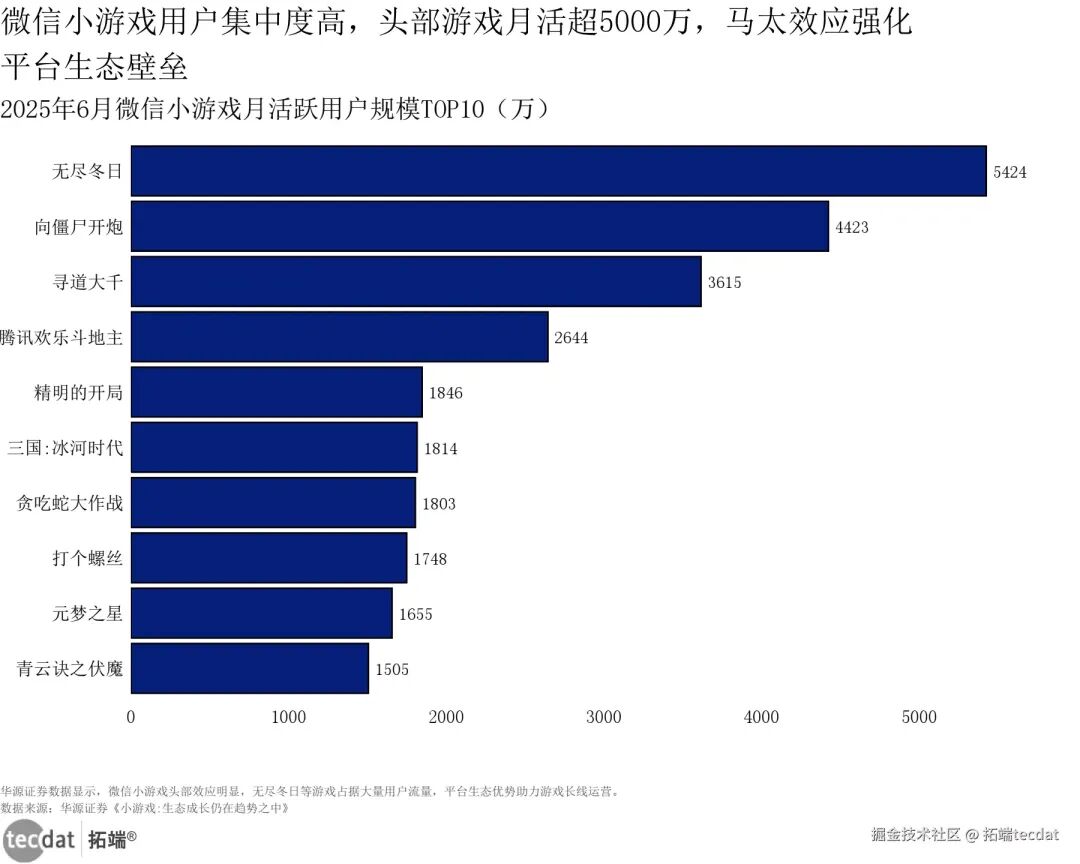 3秒解读:用户对初体验容错率极低,广告一致性、难度适配、流畅性是留存“三道关”。行动建议:开发者需在新游前10关降低难度梯度,确保广告与游戏内容高度匹配,将加载速度优化至3秒内,守住用户留存第一道防线。用户弃游原因分布灰底比例条形图表1数据EXCEL及图表PDF模板已分享到会员群头部效应持续强化,市场分化加剧“马太效应”。2025年6月微信小游戏月活TOP10中,《无尽冬日》以5424万月活遥遥领跑,前三位游戏月活均超3600万,而第十名《青云诀之伏魔》月活仅1505万,头部与尾部差距达3.6倍,核心流量向头部集中,中小厂商突围难度加大。