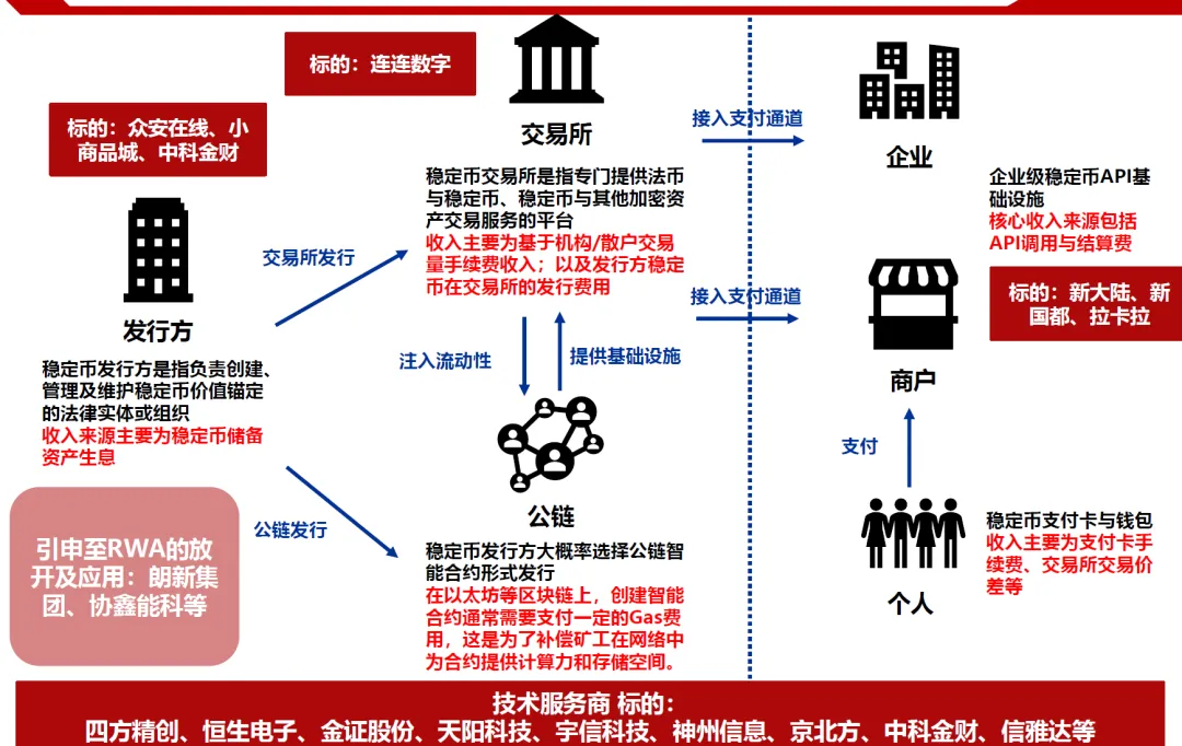 基于全牌照优势与生态布局,国富量子在数字资产方面布局覆盖"稳定币发行一合规交易一托管/银行服务一专业资管(主动管理+基金投资)一应用生态(RWA、加速器)一底层资产配置"在IT技术应用创新层面,双方将深入研究区块链、人工智能、大数据、隐私计算、量子科技等基础技术在稳定币运营平台(包括稳定币软硬钱包)、虚拟资产交易平台、RWA及供应链金融平台等应用场景落地的IT基础设施建设保障。.例如RWA方向可能商业模式包括:咨询服务,通过为客户提供全流程的RWA咨询服务收取服务费;资产上链技术服务,为客户提供完整的业务解决方案,或根据客户需求提供上链技术支撑;搭建虚拟资产交易平台并提供交易服务,公司将以合规为前提,从技术供应商向综合服务运营商方向升级。前期已有数字人民币系统建设及应用推广技术储备,稳定币相关可复用。
