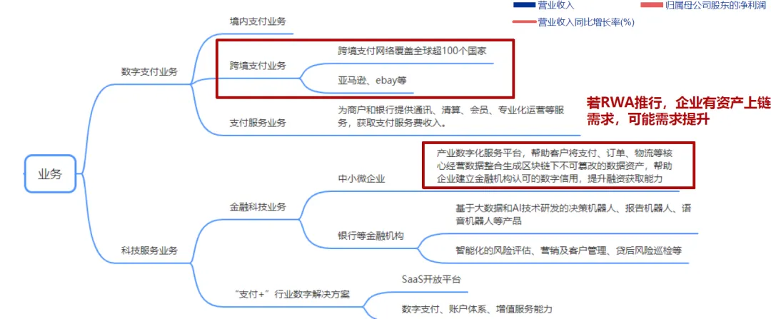 公司业务可分为数字支付业务、科技服务业务。其中数字支付业务主要为境内收单及跨境支付,科技服务业务主要包括金融科技业务以及"支付+"行业数字解决方案。