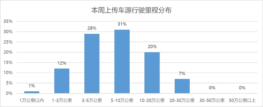 从上传车源行驶里程数据来看,1-3万公里“准新车”数据与上周持平,3-5万公里的“较新车”数据较上周减少了1%,5-10万公里的“性价比”车源数据则较上周增加了1%,10万公里以上“老旧”车源数据与上周持平,本周上报数据质量较上周略差。