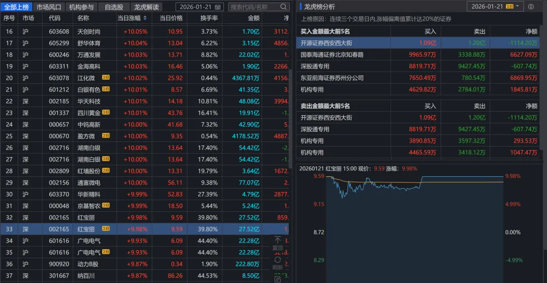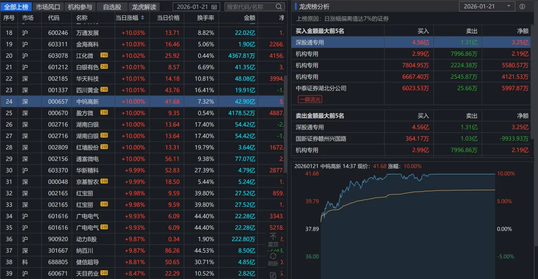 贵金属(+7.97%):现货黄金突破4800美元/盎司,地缘冲突(格陵兰岛问题、美欧关税)助推避险需求。个股:招金黄金、四川黄金涨停。