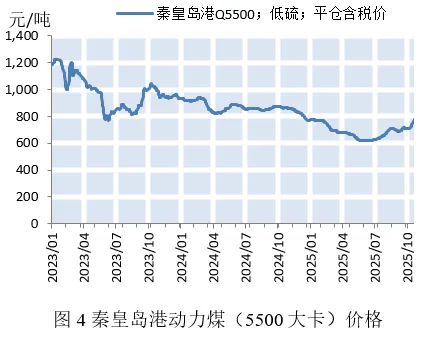 国内煤炭方面,煤价小幅上升。截至10月24日,秦皇岛港Q5500动力煤现货价格报收于778元/吨,较上期小幅上升9.12%(如图4)。