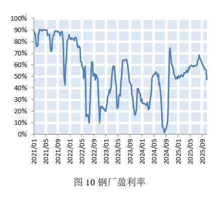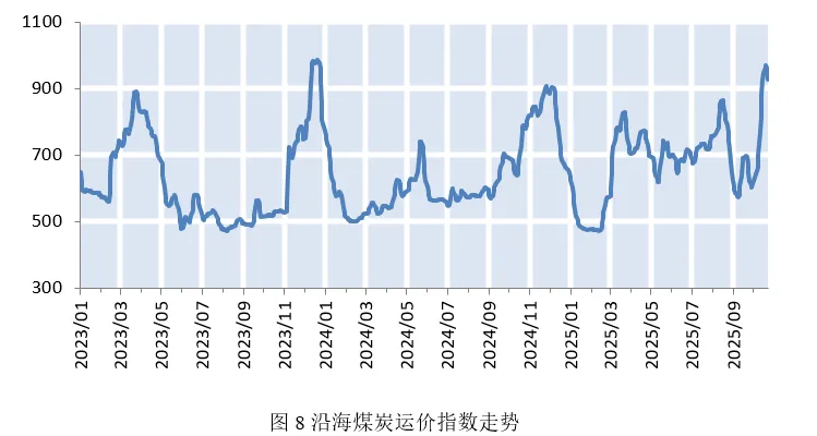 本期,北方港口库存和铁路调入量均大幅下降,水路调出量小幅上升,总体上调入低于调出。本期(2025年10月11日-2025年10月24日)秦皇岛港口煤炭日均铁路调入量为44.12万吨,较上期(2025年9月20日-2025年10月10日)大幅下降11.53%;日均水路调出量50.62万吨,较上期小幅上升8%;秦皇岛港内贸煤炭库存为550万吨,较上期大幅下降14.2%(如图6)。本期秦皇岛港锚地平均船舶数量17艘,较上期减少1艘(如图7)。预测:各航线运价大幅攀升,预计下期运价小幅回落 本期,南方气温下降明显,前期降雨及大秦线检修的滞后影响煤炭发运,港口煤炭库存和六大电厂存煤量均有下降,市场货源供应偏紧,沿海煤炭运价大幅上涨。截至10月24日,上海航运交易所发布的沿海煤炭运价指数报收于927.31点,较上期大幅上升32.74%(如图8)。下期,随着大秦铁路秋季检修结束,煤炭供应逐渐宽松。而下游电厂日耗处于下行低位,需求难有大规模释放。在即期货盘阶段性释放后,下游对煤炭价格接受度下降,预计成交量将有所回落。预计下期沿海煤炭运价增速逐渐收窄,运力周转逐渐恢复正常后将小幅回落。需求:钢价和钢厂盈利率均小幅下降