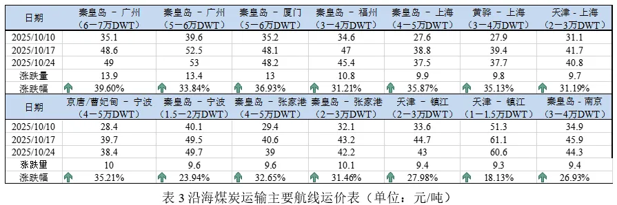 市场综述:沿海散货运价指数大幅上涨,散货船日租金指数大幅攀升上海航运交易所2025年10月24日发布的中国沿海散货运价指数(CBFI)报收于1158.21点,较10月10日大幅上涨12.76%(如图1)。三大货种方面,煤炭涨幅领先,矿石和粮食均大幅上升(如表1)。上海航运交易所2025年10月24日发布的中国沿海散货船日租金指数(CDI)报收于2764.32点,较10月10日大幅攀升87.85%(如图2)。各船型租金均大幅上升,其中巴拿马型船(7.6万DWT)大幅上升114.52%至100618元/天(如表2)。截至10月24日,沿海六大电厂的存煤量为1390.6万吨,较上期末小幅下降2.28%;日均耗煤量为78.48万吨,较上期末小幅下降6.88%;可用天数维持在17.7天左右,较上期减少0.9天(如图3)。供给:国内煤价和国外煤价均小幅上升