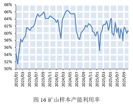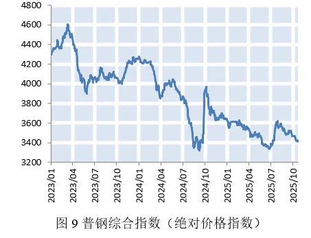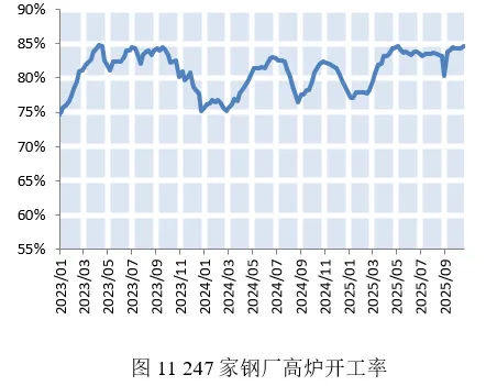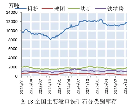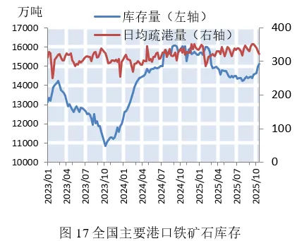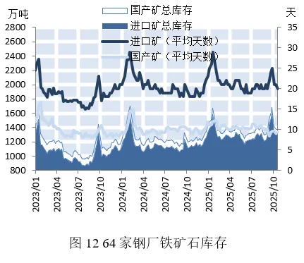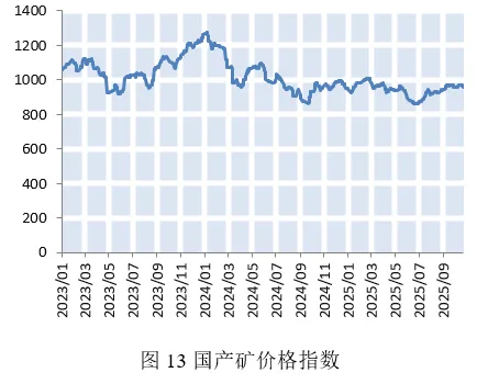本期,钢材价格小幅下降。截至10月24日,普钢综合指数(绝对价格指数)报收于3420.99点,较上期小幅下降1.35%(如图9)。钢厂盈利率报收于47.62%,较上期小幅下降8.66%(如图10)。本期,钢厂高炉开工率微幅上升。截至10月24日,全国调研的247家钢厂高炉开工率为84.71%,较上期微幅上升0.44%(如图11)。本期,全国64家钢厂进口矿库存和国产矿库存均小幅下降。截至2025年10月24日,全国调研的64家钢厂进口矿库存1291.42万吨,进口矿平均可用天数20天,较上期减少1天;国产矿库存77.5万吨,国产矿平均可用天数9.51天,较上期增加0.45天(如图12)。国产矿方面,本期国产矿价格小幅下降。截至10月24日,霍邱地区65%造球精粉价格指数报收于959点,较上期减少2点(如图13);