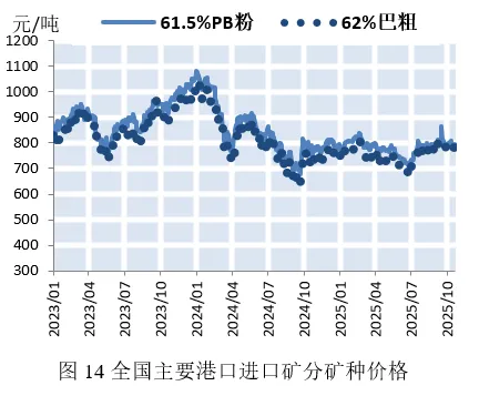 进口矿方面,本期进口矿价格小幅下降。截至10月24日,61.5%PB粉报收于792.5元/吨,较上期减少9.5元/吨;62%巴粗报收于789元/吨,较上期减少3元/吨(如图14)。