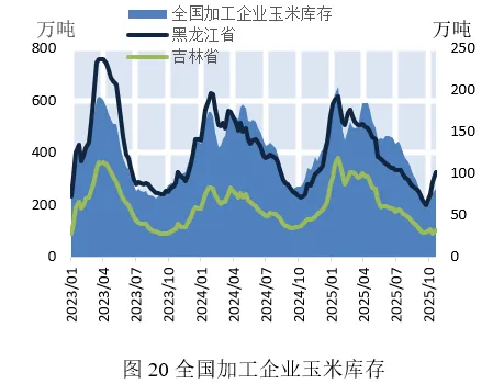 本期,深加工企业玉米库存小幅增加。截至10月24日,全国加工企业玉米库存262.2万吨,较上期小幅增加28.8万吨(如图20)。