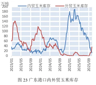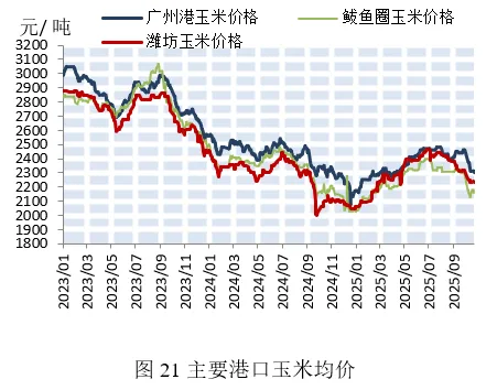 本期南北方玉米市场价格小幅下降。截至10月24日,广州港玉米价格为2300元/吨,较上期(10月10日)减少70元/吨,鲅鱼圈玉米价格为2160元/吨,较上期减少20元/吨,潍坊玉米价格为2230元/吨,较上期减少20元/吨(如图21)。