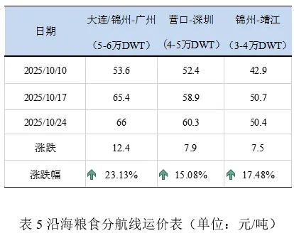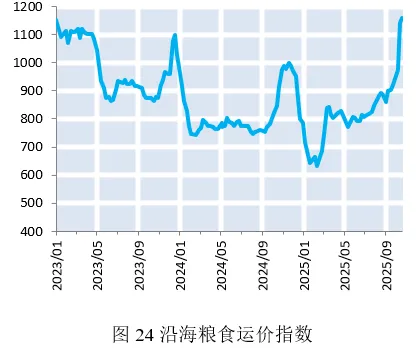 本期,北方港口下海量小幅上升,南方港口内贸库存小幅下降。本期(2025年10月11日—2025年10月24日)北方四港玉米下海量共计138.5万吨,较上期(2025年9月20日—2025年10月10日)增加54.3万吨;广东港口内贸玉米到货量为42.9万吨,较上期上升10.4万吨;外贸玉米到货量为26.2万吨,较上期增加21.2万吨(如图22)。截至10月24日,广东港口内贸玉米库存11.8万吨,较上期减少9.7万吨;外贸玉米库存36.2万吨,较上期增加24.5万吨(如图23)。本期,用粮企业补库需求回升,北方港口集港量回升到高位水平,沿海粮食运输需求平稳释放,叠加北方港口封航,可用运力周转不足,沿海粮食运价大幅上涨。截至10月24日,上海航交所发布的沿海粮食运价指数报收于1161.13点,较上期大幅上升19.03%(如图24)。各航线运价均大幅上涨,其中大连/锦州-广州(5-6万DWT)运价大幅上升23.13%至66元/吨(如表5)。下期,市场整体供需平稳,随着沿海散货市场运力周转效率的回升,预计下期沿海粮食运价高位回落,涨幅收窄。▊所长:周德全(兼航运景气指数编制室主任) 博士.高工▊主要研究骨干:陈悠超 王毅 冒恺荣 唐旭峰 杨煜瀚 常凯飞 张浩若 向春荣 田思颖 朱梦雨 刘芷琪 刘嘉杰 陈柬桥 夏雨荷 刘志涛▊主要报告产品:《中国航运景气报告》《中国干散货海运市场分析报告》《中国集装箱海运市场分析报告》等系列产品(年报、半年报、季报及双周报)▊从事航运市场分析、行业政策研究、企业战略规划、船舶投资可研等咨询业务▊联系电话:021-65853850转8039/8017/8016