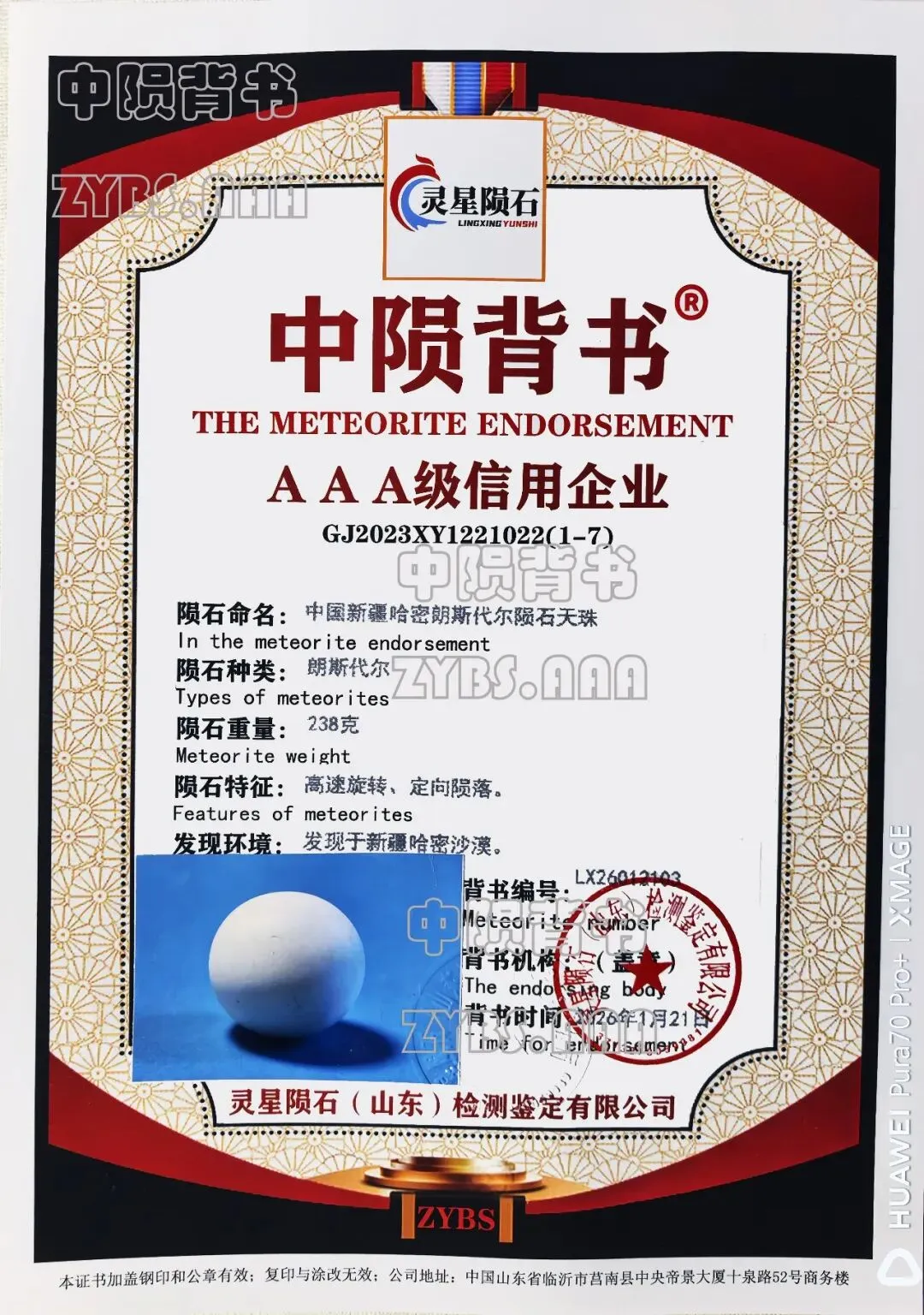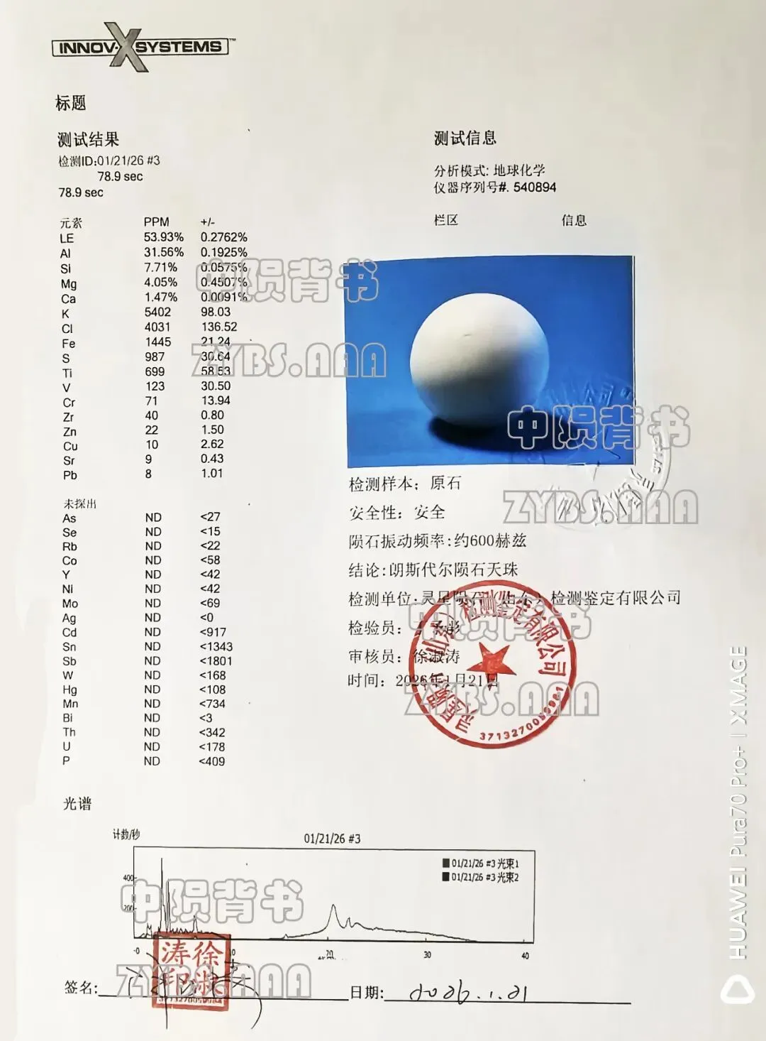 2. 该陨石呈规则圆珠体,奶白色,重238克,规格4.4cm×4.5cm,表面覆盖致密熔壳,物理特征典型;主量元素以轻元素(53.93%)和三氧化二铝(31.56%)为主,含多种特征微量元素,振动频率约600赫兹,化学成分与物理属性均符合月球朗斯代尔陨石的核心特征。