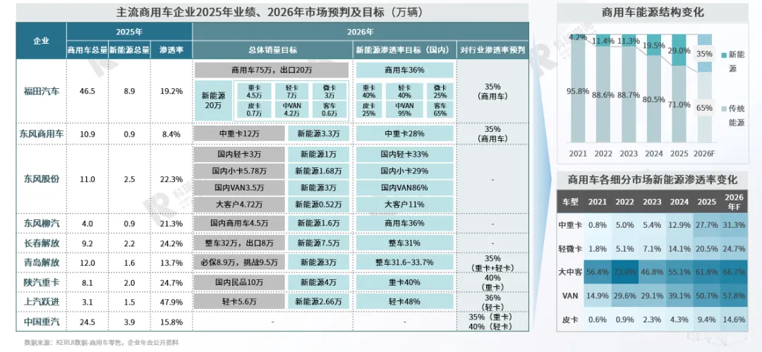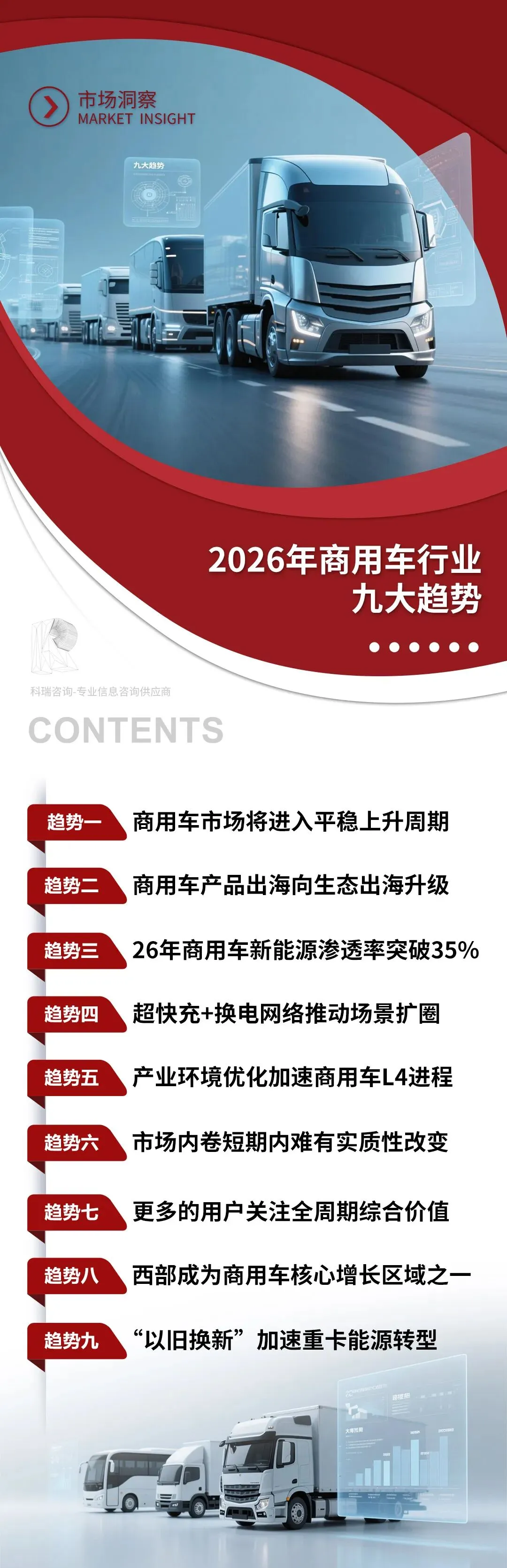 根据终端数据显示,2025年商用车新能源渗透率达到29%,综合目前各细分市场表现及主流企业判断,预计2026年新能源商用车持续快速增长趋势,渗透率将突破35%。市场加速由“政策驱动”转向“市场驱动”,车企持续加大新能源产品布局,用户对新能源商用车的态度正从被动接受转向主动选择。