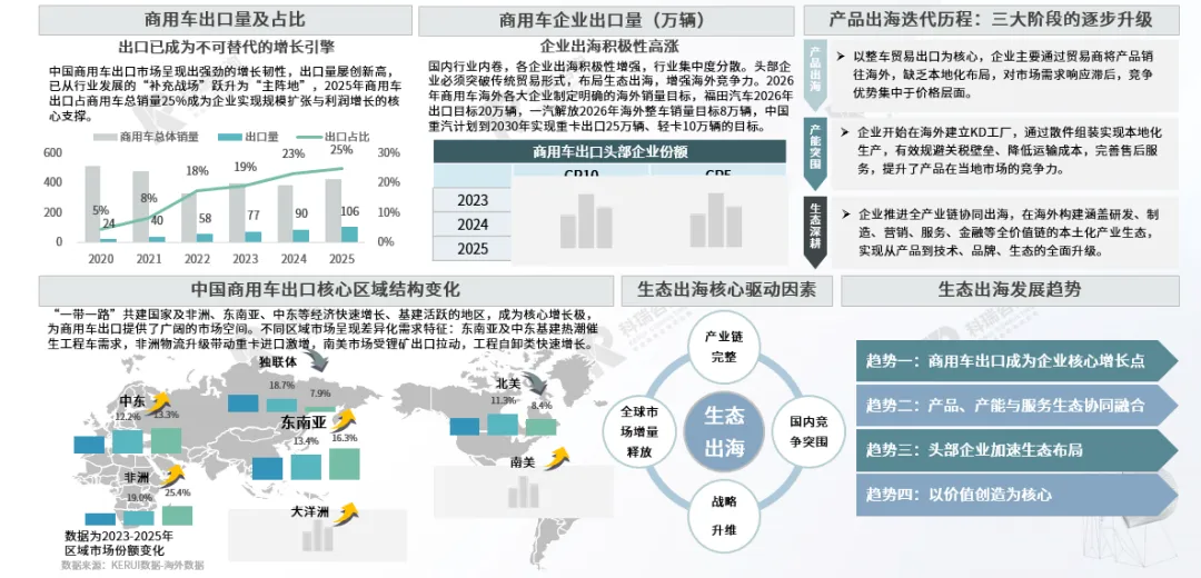 近年来,商用车出口持续保持高速增长态势,成为拉动行业发展的核心增量引擎。与此同时,行业“出海”模式正经历深刻变革,从早期单一的整车产品出口,逐步向产能突围生态本土化、品牌国际化的生态深耕进阶,企业竞争焦点也从价格比拼转向生态协同与产业深耕能力的综合较量。