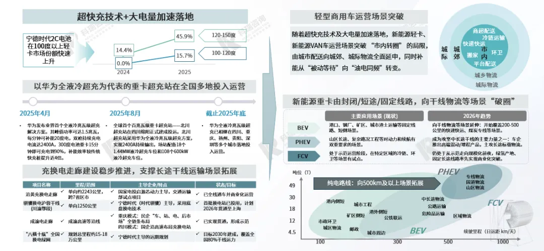 2025年新能源商用车大电量趋势明显,2026年,大电量将逐渐成为主流。随着以华为全液冷超充为代表的重卡超充站在全国多地投入运营,补能效率显著提升。同时,大电量、超快充技术与长途干线充换电基础设施建设的协同发展将全面优化商用车的运营效率与使用体验,加速电动化进程,推动新能源在不同场景加快渗透。