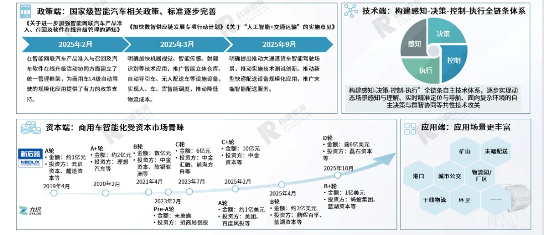 政策端,2025年国家相继推出多项支持性政策,逐步完善行业准入标准,为L4级自动驾驶技术研发与规模化应用提供了明确的政策保障。技术端,构建感知-决策-控制-执行全链路体系,关键技术难题陆续取得突破。资本端,以九识、新石器为代表的无人物流车企业2025年完成近10亿美元融资,显示出资本市场对该领域的高度关注与信心。2026年,在政策、技术、资本等多重驱动下,商用车智能化进程将进一步提速,应用场景持续向更多领域拓展,推动智能商用车从技术验证阶段全面迈向商业化落地。