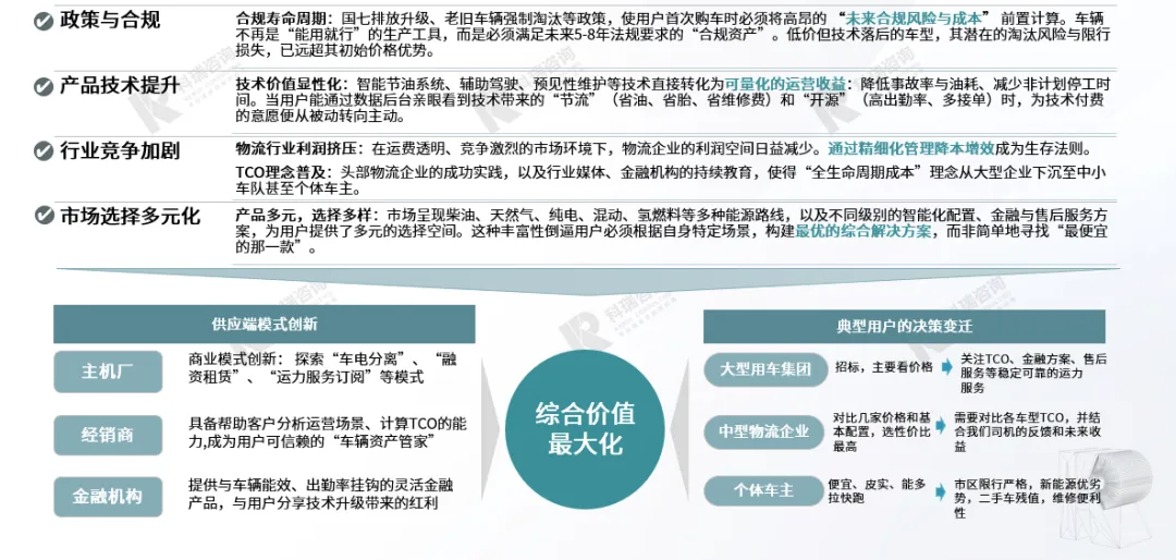 商用车核心用户采购决策逻辑发生的根本性转变。这种转变的核心,是从单一、显性的“初始购买价格” 敏感,演变为对 “全周期综合价值” 的精细化考量。驱动这一转型的力量,根本在于政策与合规、产品技术提升、行业竞争加剧以及市场选择多元化等。