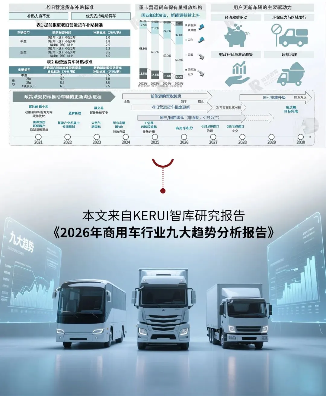 2025年12月30日,“两新”政策明确延续,及时给市场吃了一颗“定心丸”,稳定了市场预期。政策延续去年补贴力度,同时强调优先支持电动货车,这意味着,一方面2026年国四及以下货车将持续加速淘汰进程,另一方面,新能源货车市场仍将保持快速增长势头,渗透率进一步上升。