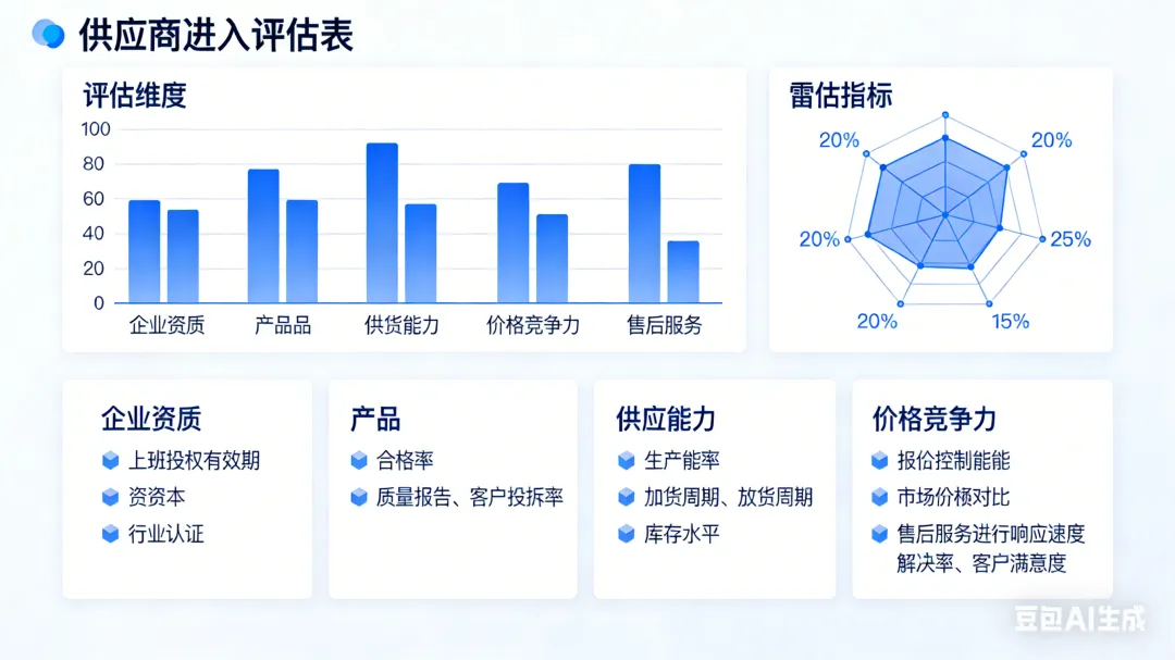 :存在重大质量事故、廉洁违规、负面舆情、环保违法记录的供应商,直接拒绝准入。 - 动态调整