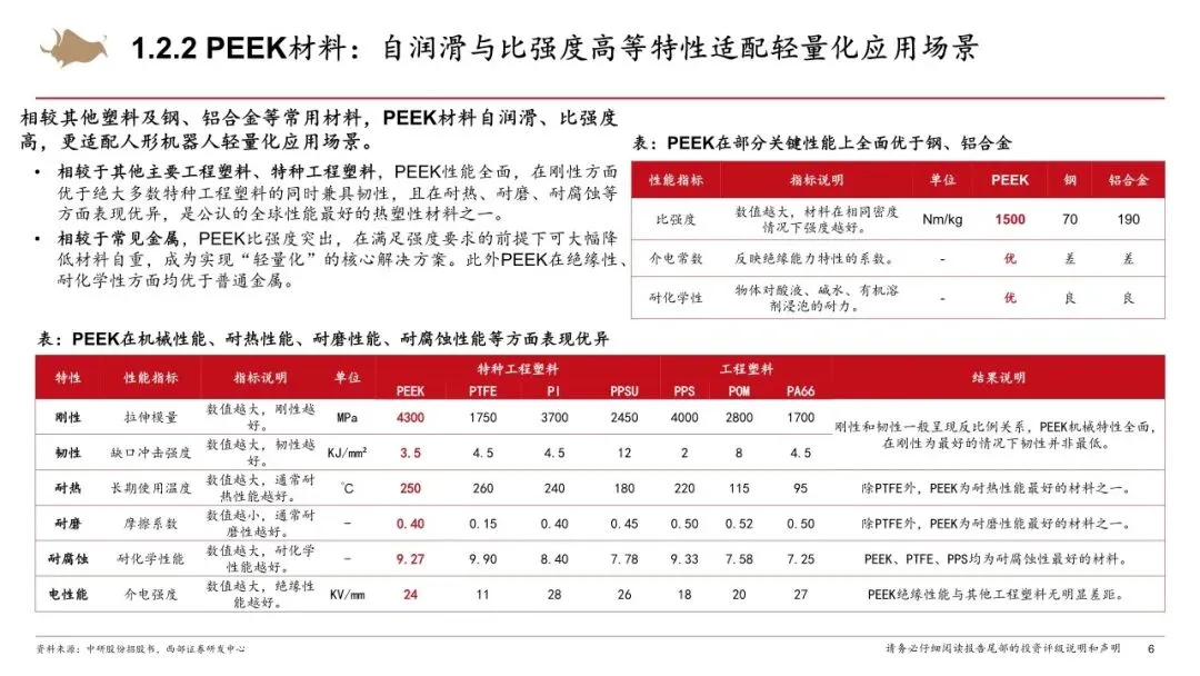 相较其他主要工程塑料、特种工程塑料及钢、铝合金等常用材料,PEEK材料自润滑、比强度高,更适配轻量化应用场景。