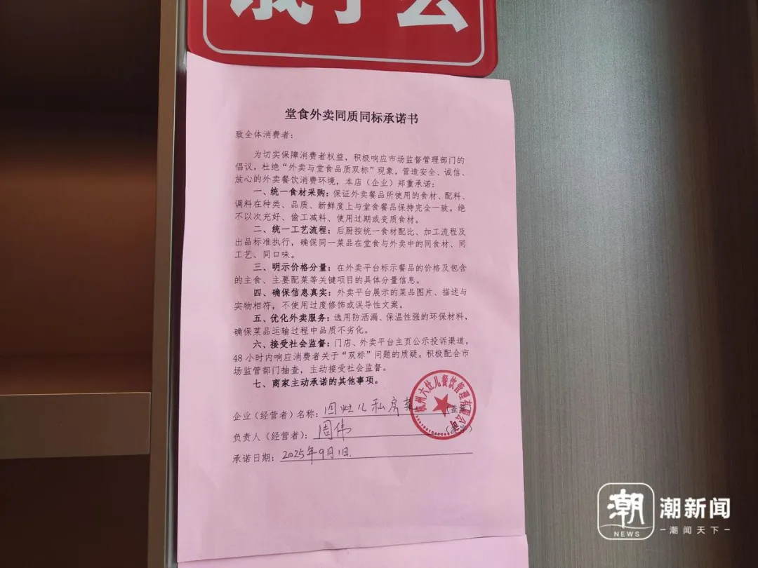 “四灶儿”湖墅南路店门口张贴着的“堂食外卖同质同标承诺书”
