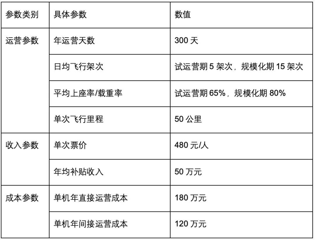 盈利平衡点测算核心公式:年盈利 = 年运输服务收入 + 年增值服务收入 + 年补贴收入 - 年直接运营成本 - 年间接运营成本盈亏平衡条件:年总收入≥ 年总成本2.4.1关键参数设定(以国内主流4座载人eVTOL为例)