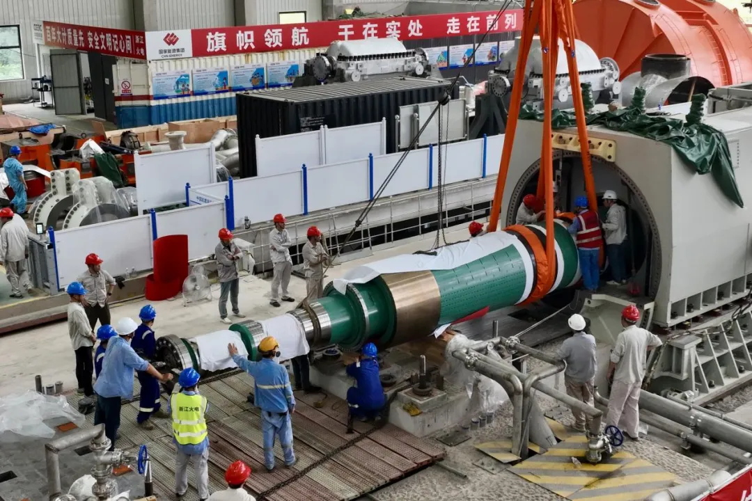 图为1号机组发电机转子穿装现场