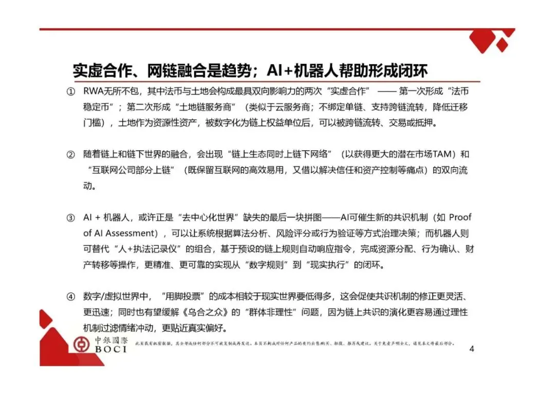 报告预测,稳定币将沿着 “实虚合作、网链融合” 的趋势持续发展:一方面,RWA 的广泛落地将推动更多传统资产上链,法币与土地的数字化将成为两次关键 “实虚合作”—— 法币稳定币已实现规模化应用,土地等资源性资产数字化后,将形成 “土地链服务商”,支持跨链流转、交易和抵押;另一方面,AI 与机器人技术将成为稳定币生态的 “最后一块拼图”,AI 可催生 Proof of AI Assessment 等新共识机制,机器人可替代 “人 + 执法记录仪” 组合,自动执行链上规则,实现资源分配、行为确认、财产转移等操作,完成从 “数字规则” 到 “现实执行” 的闭环。