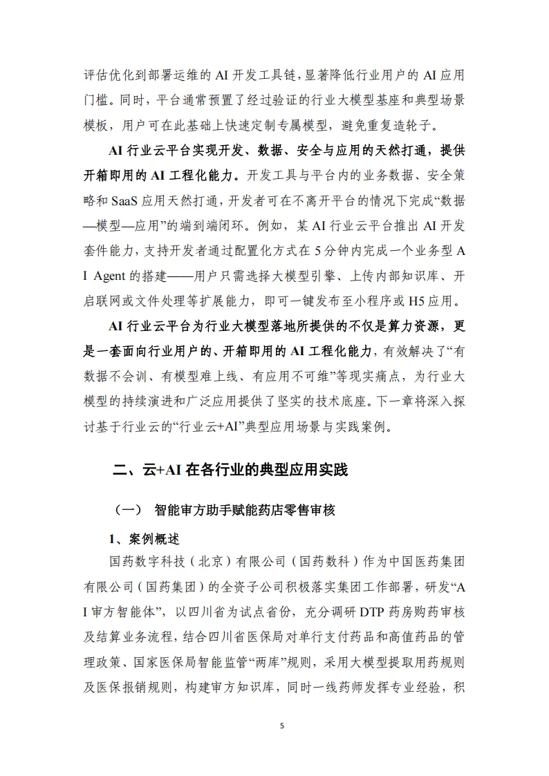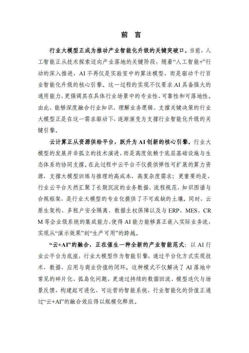 “云+AI”融合中,AI行业云平台是行业大模型落地核心载体,具备高质量数据供给、安全合规运行、成熟应用生态等优势,落地医疗智能审方、制造安全防护等多领域案例,实现效率提升与成本优化。知识图谱与大模型融合通过大模型增强图谱、图谱增强大模型、两者输出协同三类模式,互补解决各自技术局限,国内外相关标准化持续推进,收录金融、医药、电力等多行业20个实践案例,形成可复制落地模式,共同推动各行业从经验驱动向智能驱动转型,助力千行百业智能化升级。