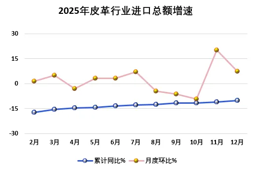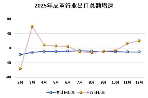 2025年1-12月,全国皮革行业产品出口总额827.2亿美元,同比下降10.9%;进口总额155.3亿美元,同比下降10.2%;进出口贸易顺差671.8亿美元,同比下降11.1%,占全国进出口贸易总顺差的5.7%。