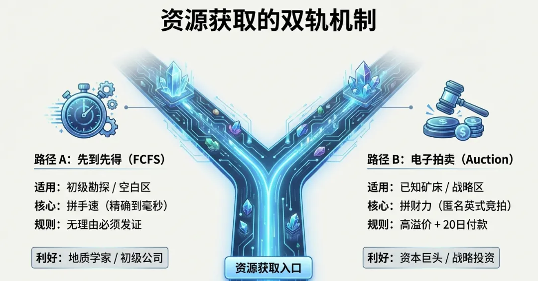 简化逻辑:对于固体矿产(不含铀矿),政府不再与企业谈判合同条款,而是直接颁发标准化的许可证。权利性质:许可证赋予持有者在特定区域、特定时间内进行底土作业的排他性权利。虽然底土资源归国家所有,但开采出来的矿产品归底土用户私有。3.2 资源分配的双轨制机制